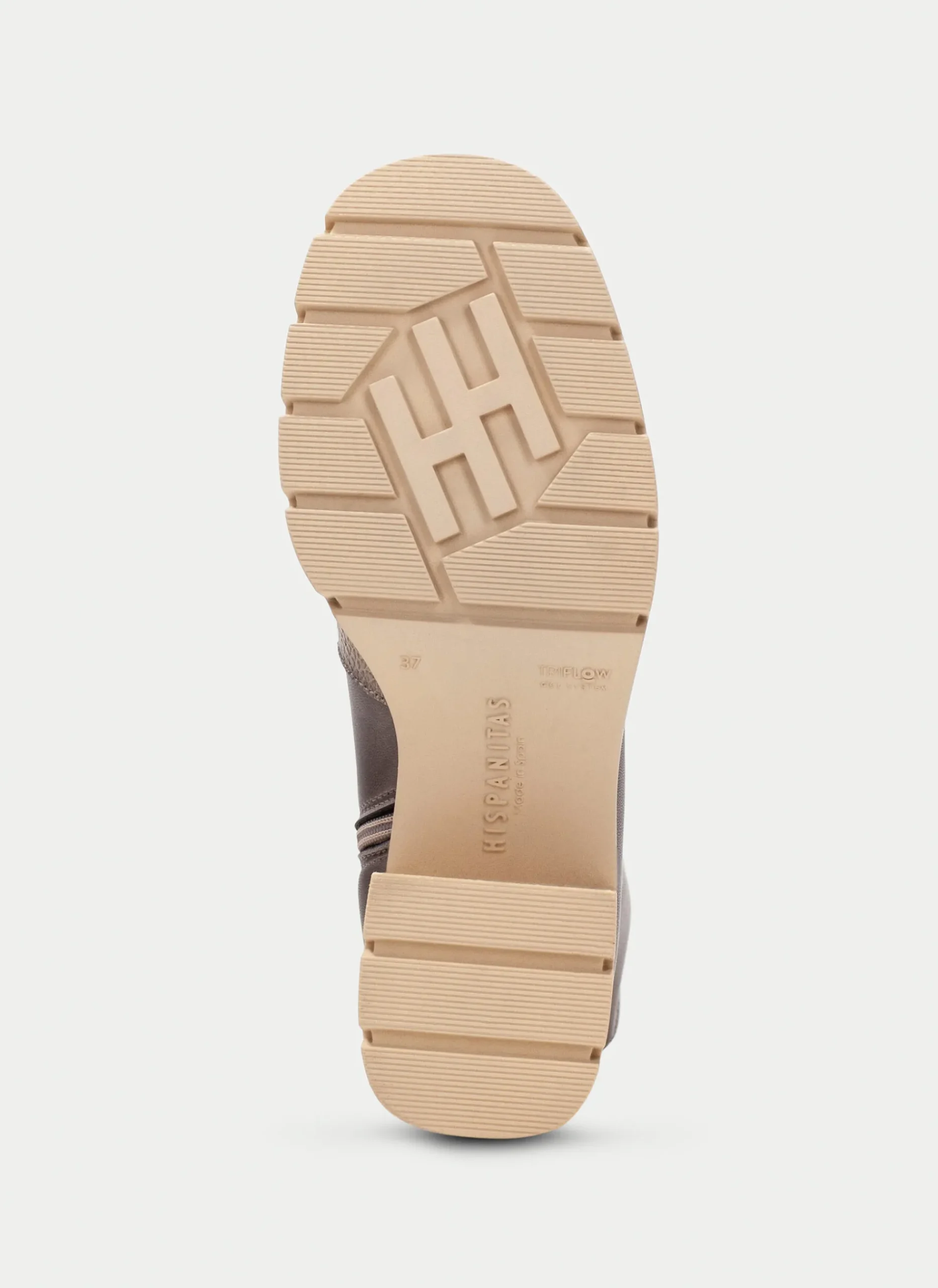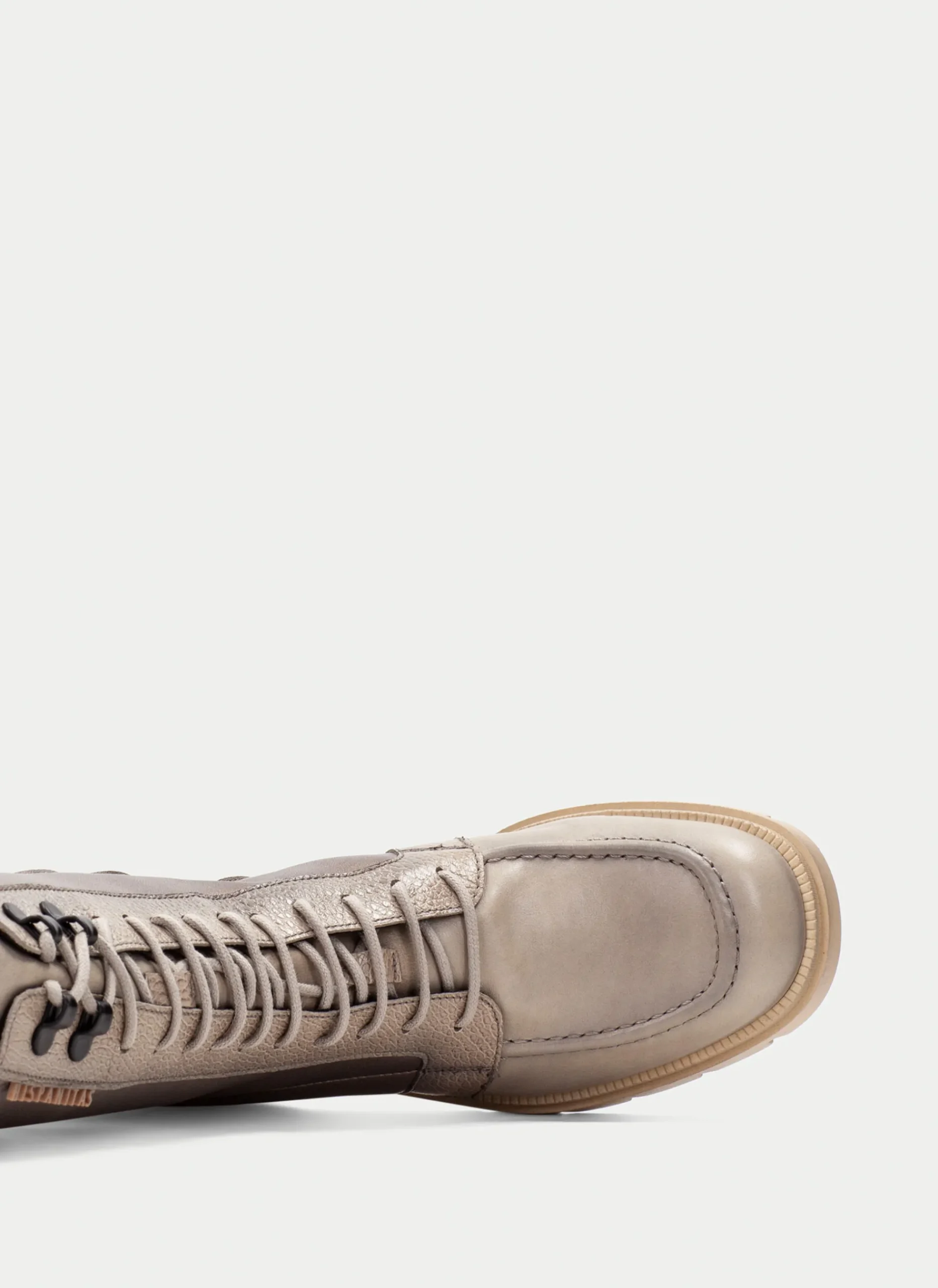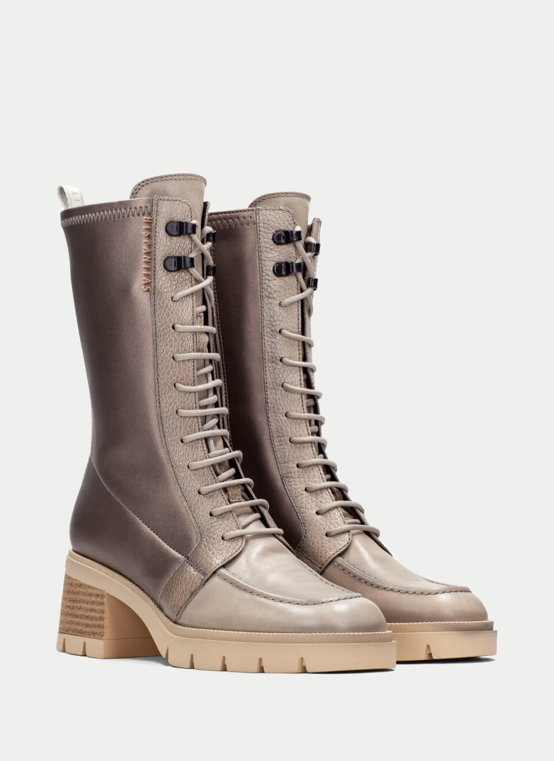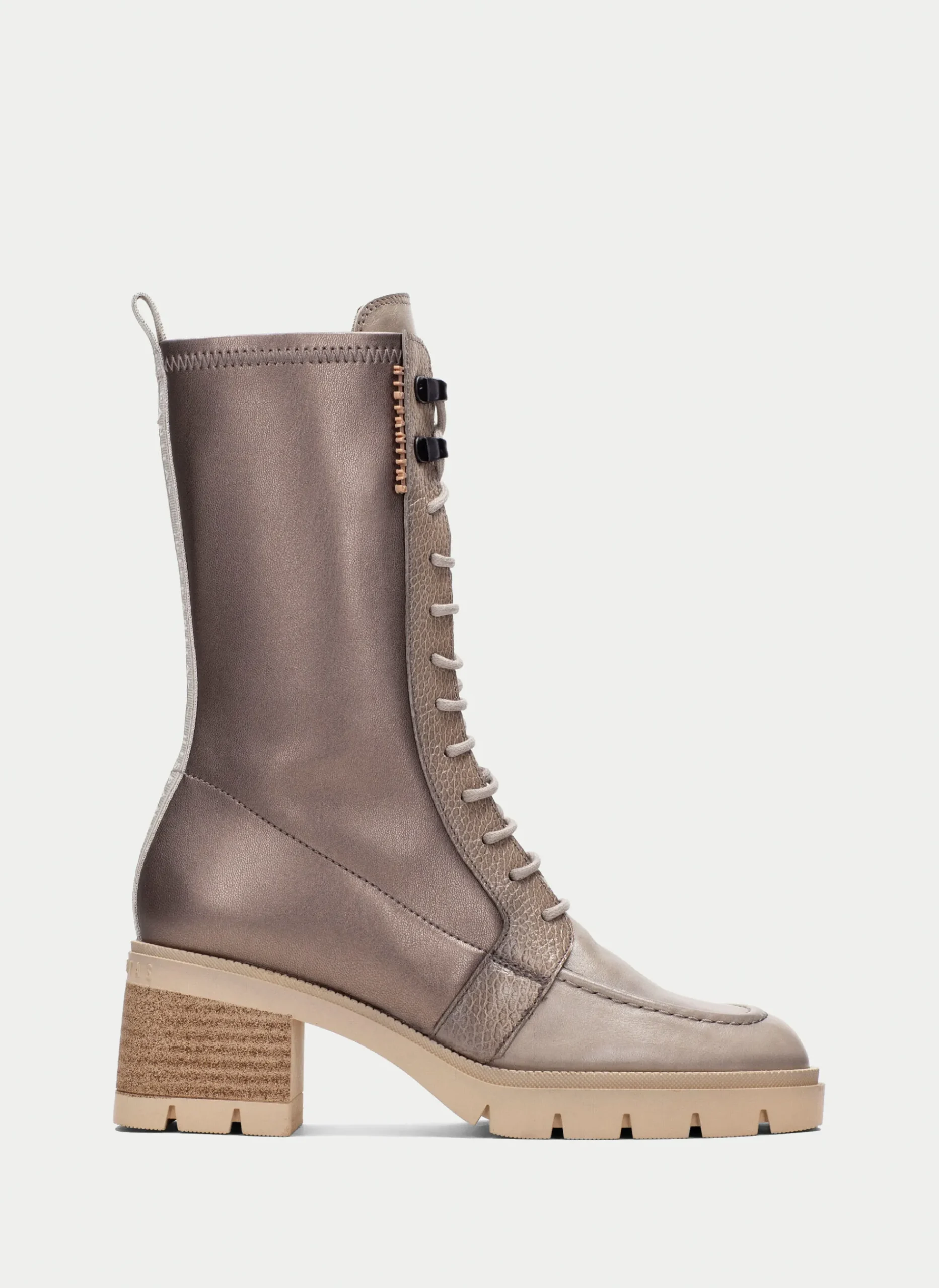 Botas com fecho de cordões na frente e fecho de correr no interior. Salto em bloco de 6,5 cm, plataforma e sola track. Este sapato incorpora a tecnologia TRIFLOW, que amortece cada passo, proporcionando flexibilidade e conforto na passada, graças ao seu amortecimento triplo.
