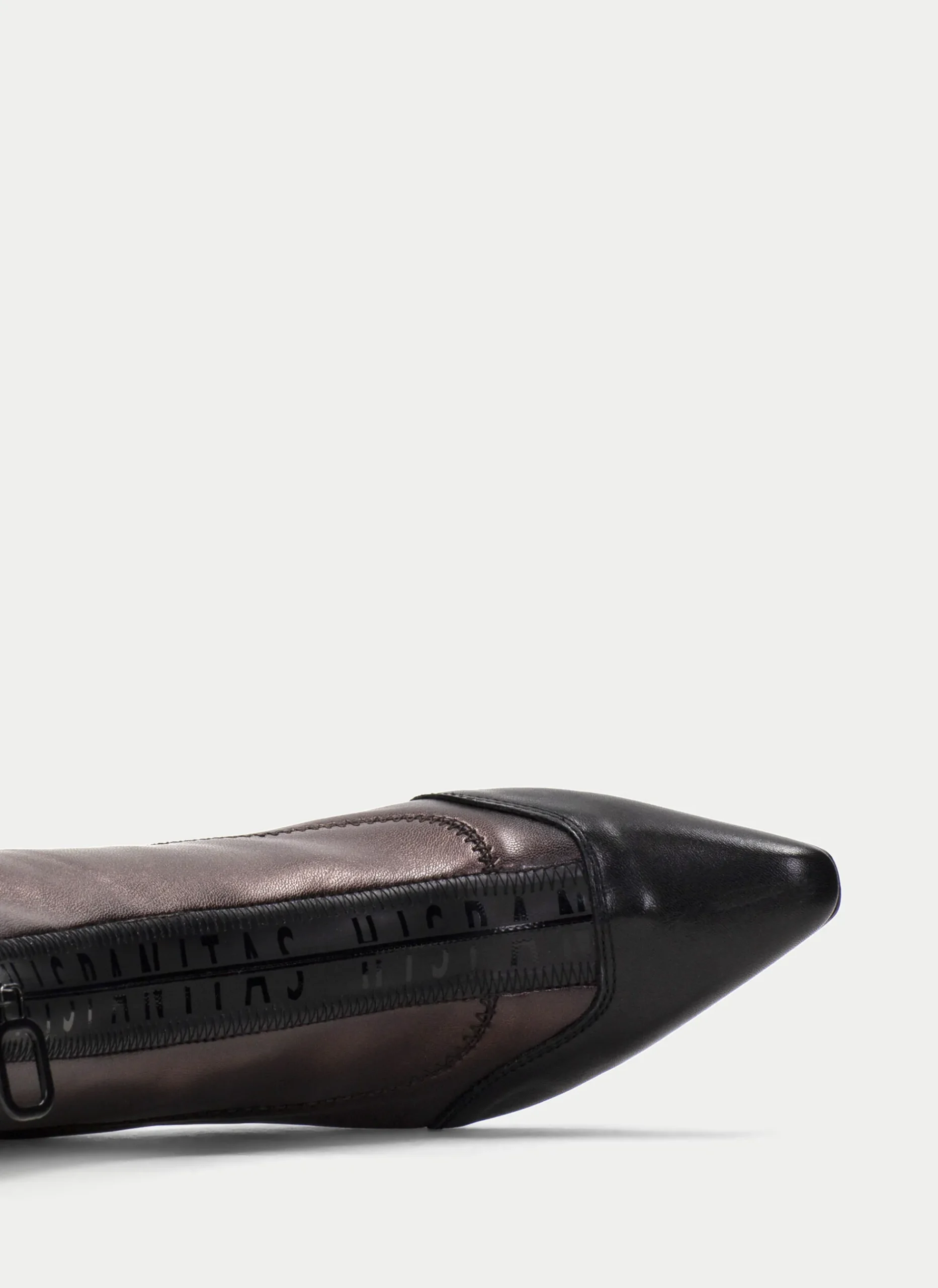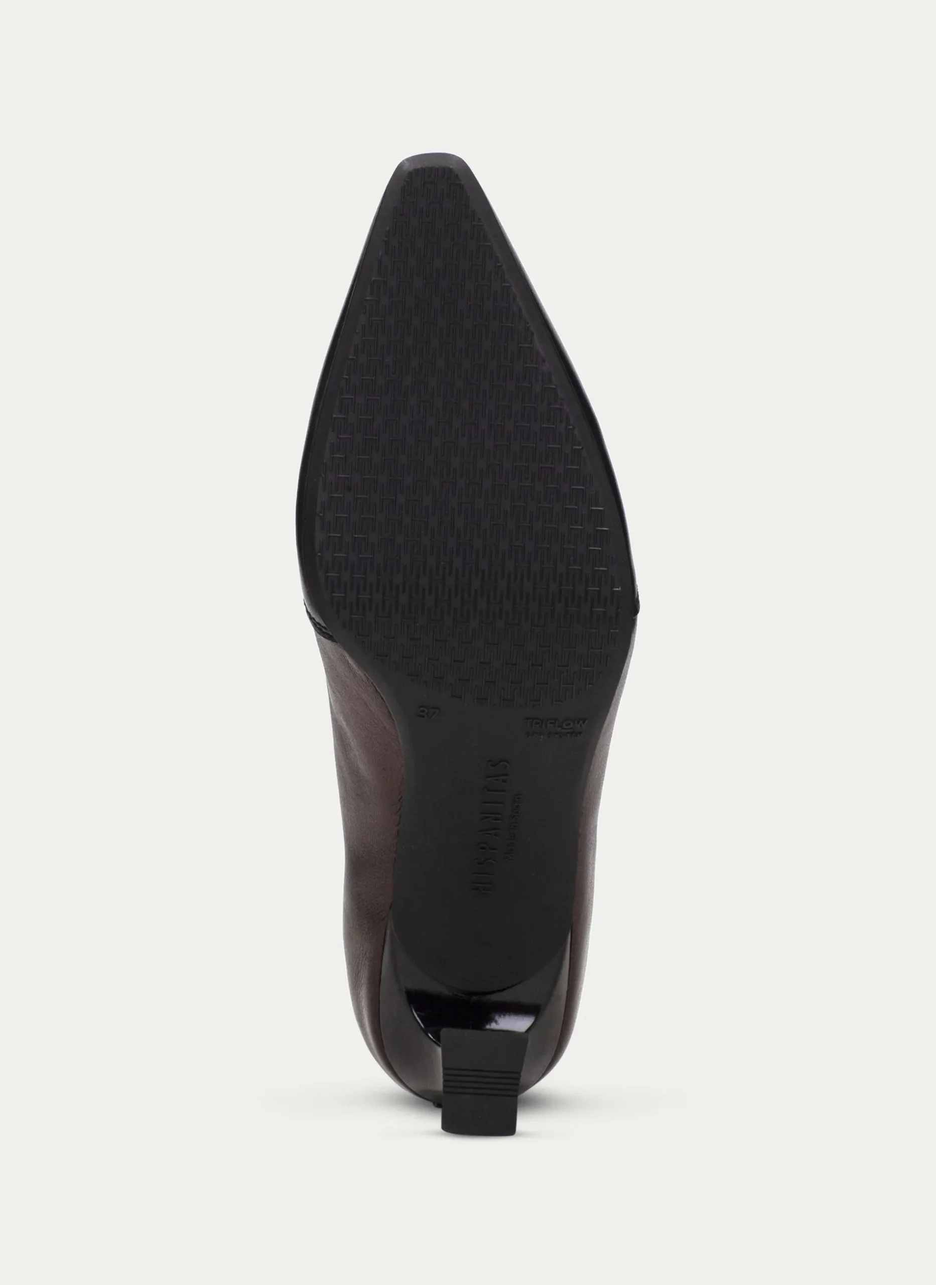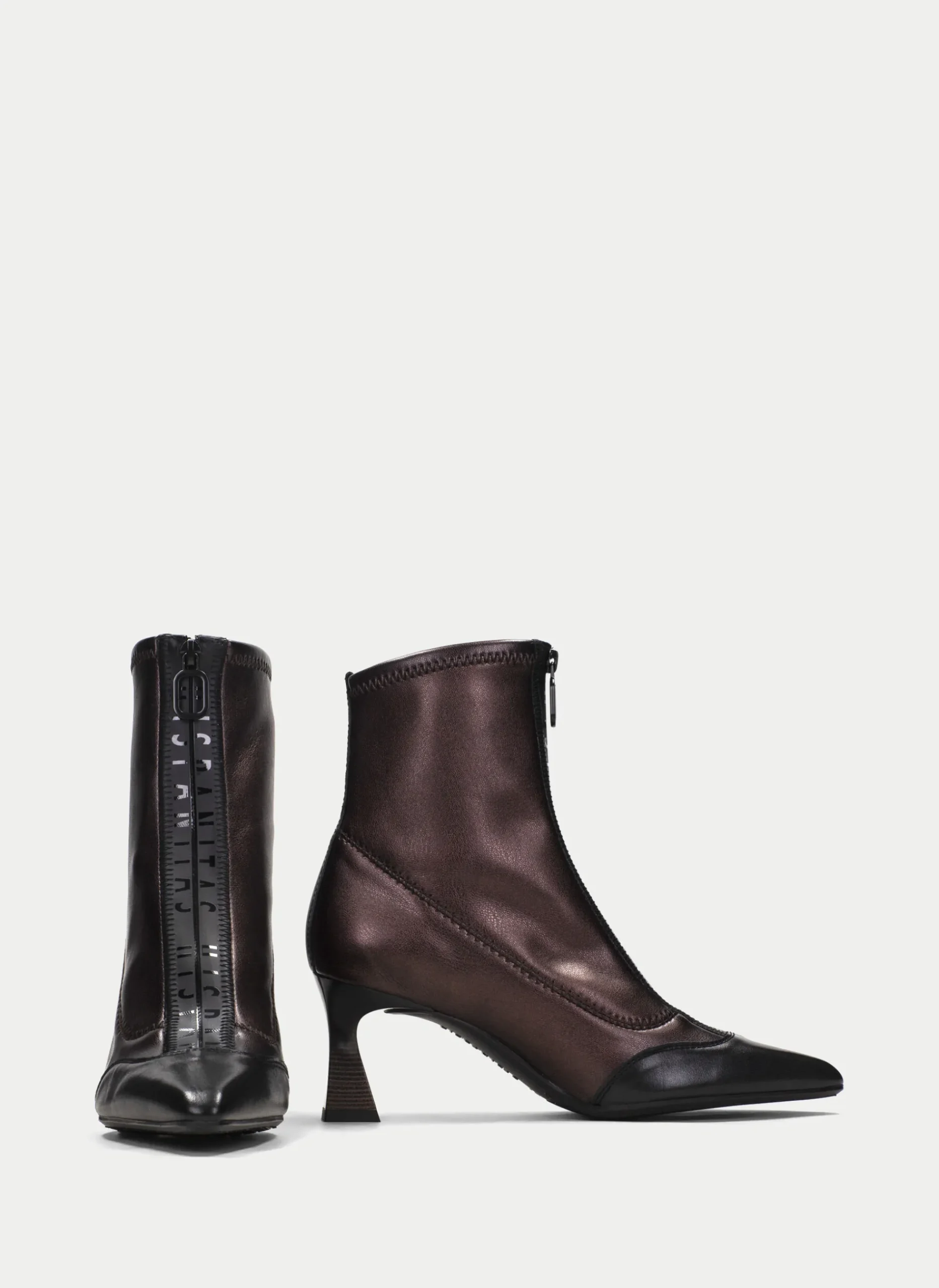 Botins com biqueira fina e um design stretch que permite um ajuste perfeito ao pé. Salto de 6,5 cm de altura e fecho de correr no peito do pé com o nome da marca. Este sapato incorpora a tecnologia TRIFLOW, que amortece cada passo, proporcionando flexibilidade e conforto na passada, graças ao seu amortecimento triplo.