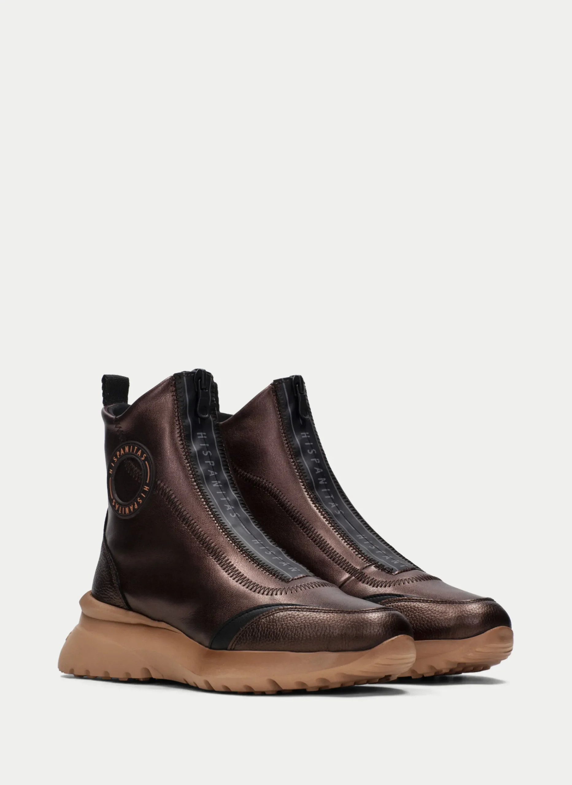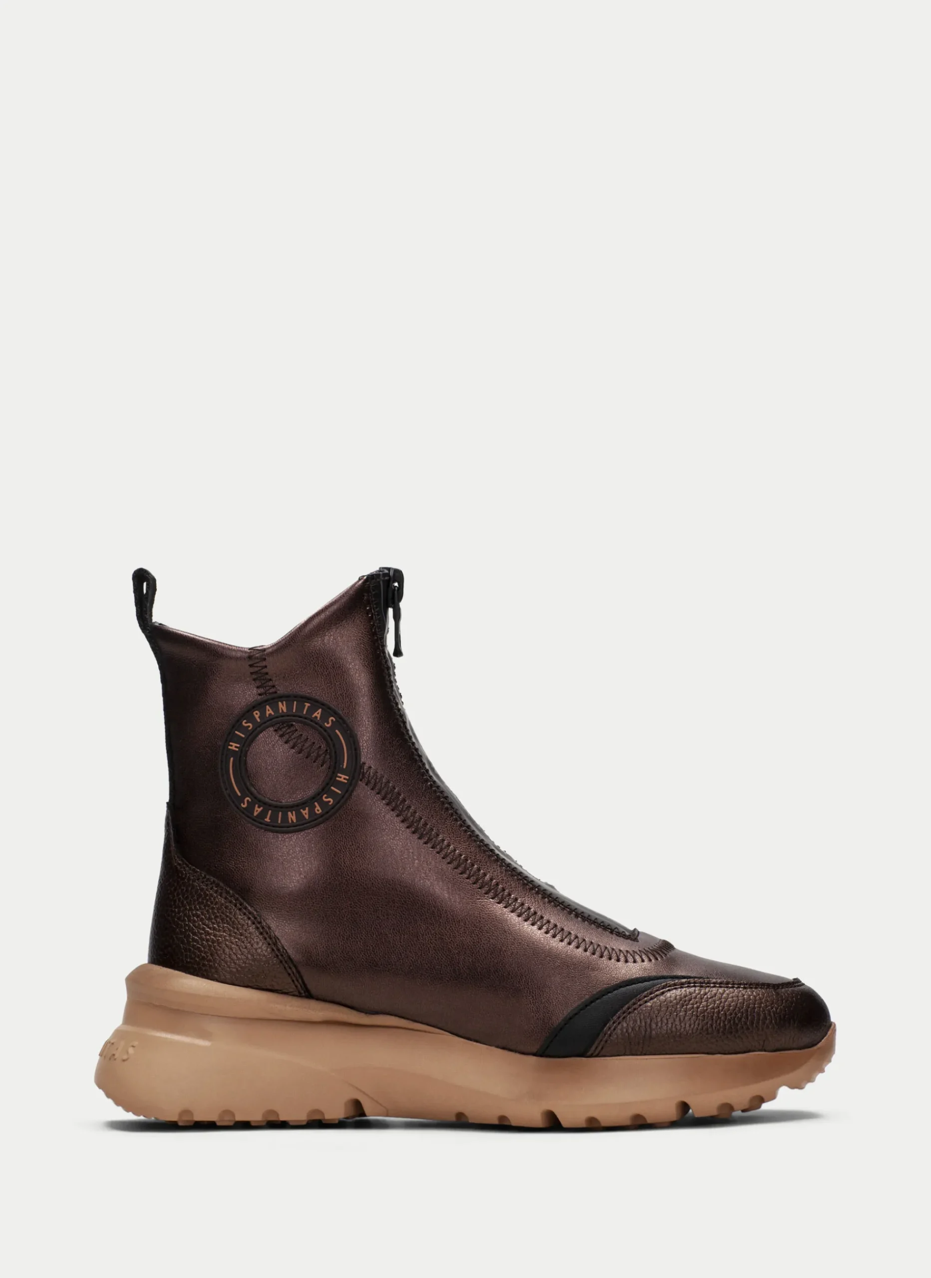 Botins desportivos com sola de volume. Design de cano stretch, pormenor do logótipo Hispanitas e fecho de correr no peito do pé com o nome da marca. Este sapato incorpora a tecnologia TRIFLOW, amortece cada passo proporcionando flexibilidade e conforto na passada, graças ao seu amortecimento triplo, e conta ainda com uma palmilha removível.