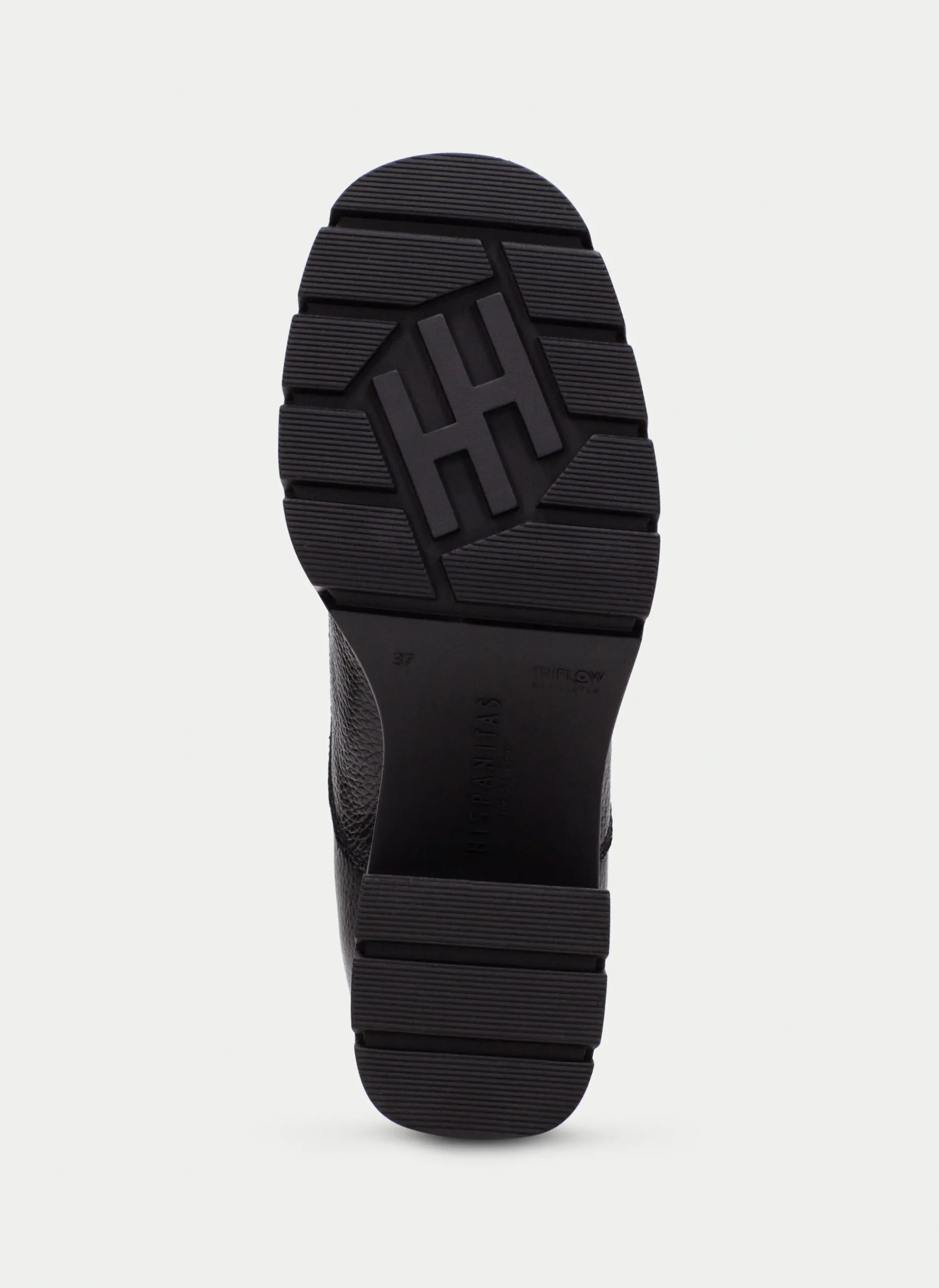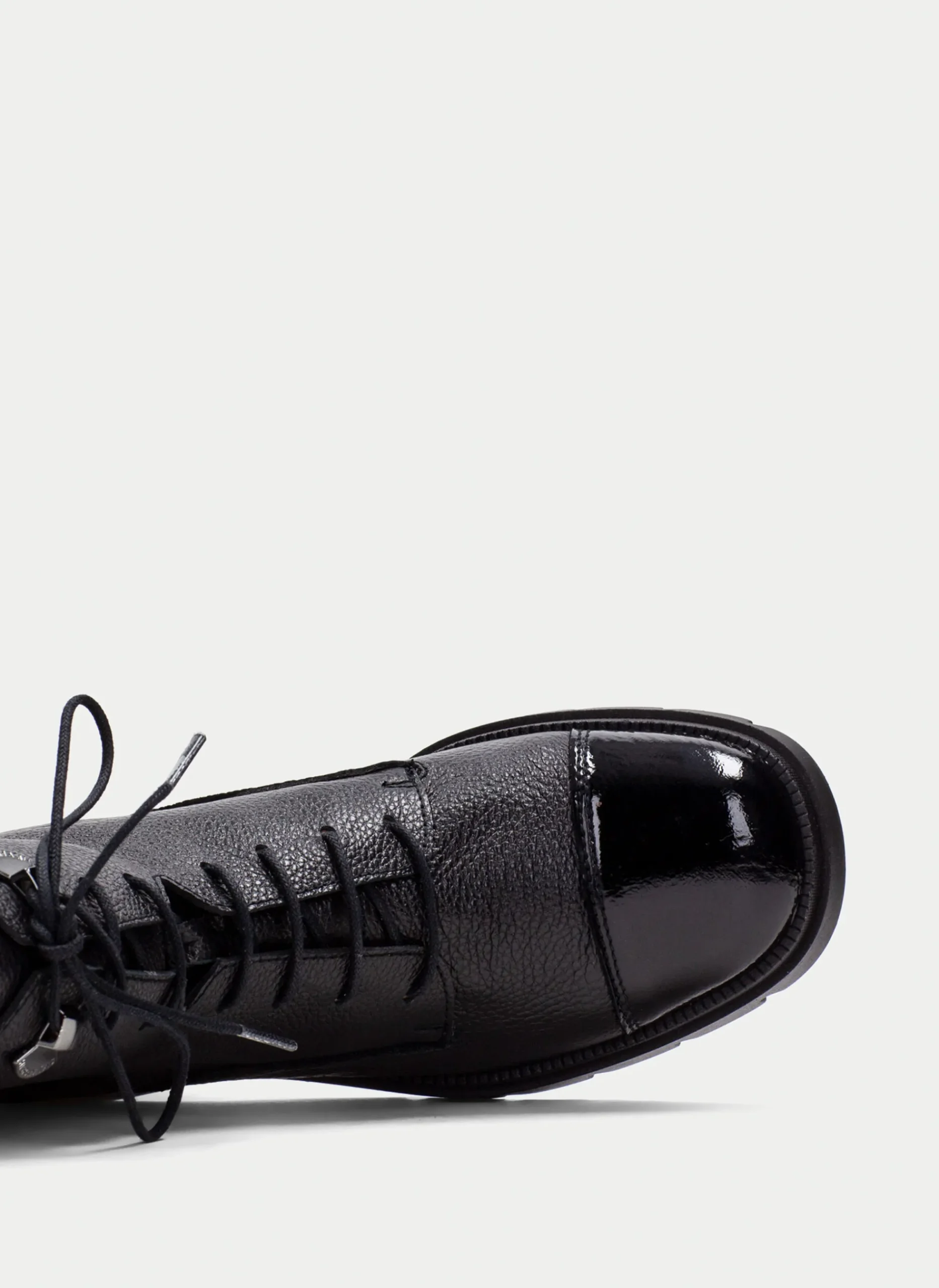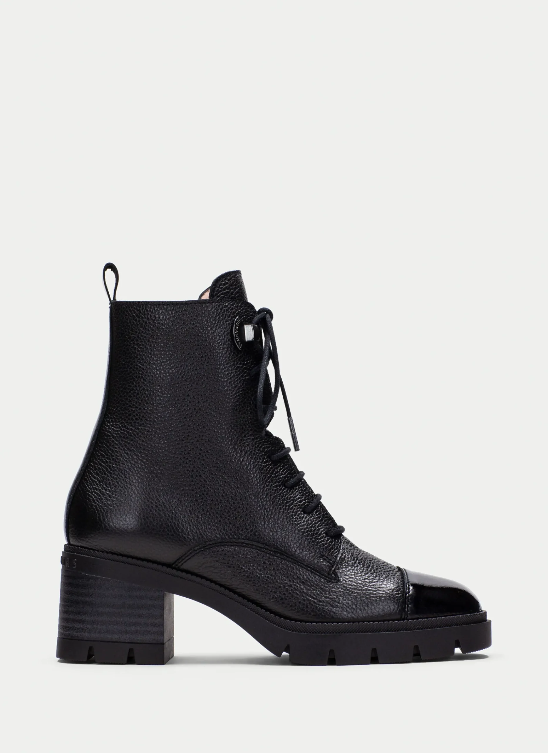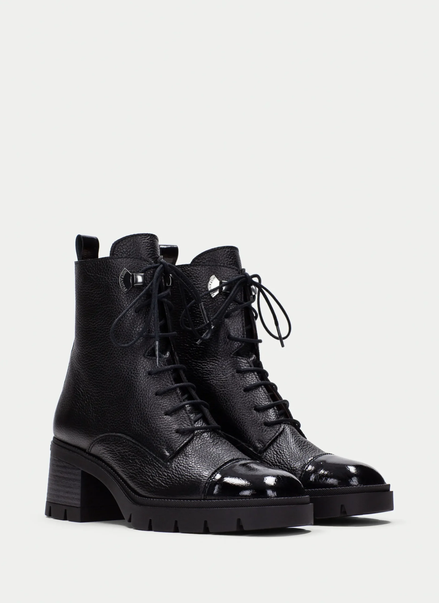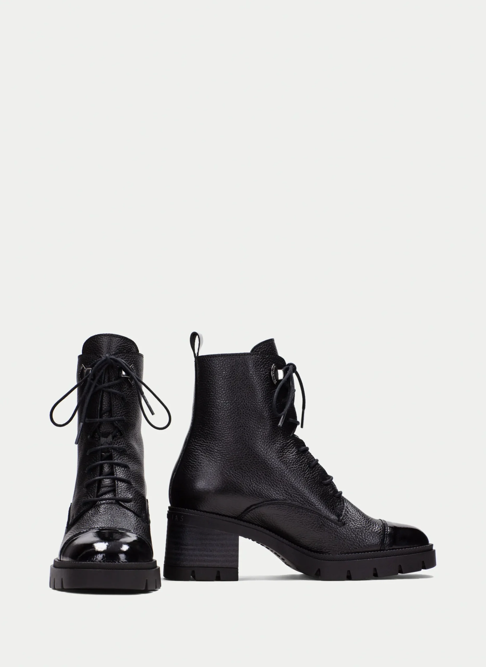 Botim de cano médio estilo militar, sola track e detalhe de bico envernizado. Fechamento com cadarços na parte frontal e salto bloco de 5 cm. Este sapato também contém a tecnologia Triflow, amortecendo cada passo e proporcionando flexibilidade e conforto graças ao seu triplo acolchoamento.