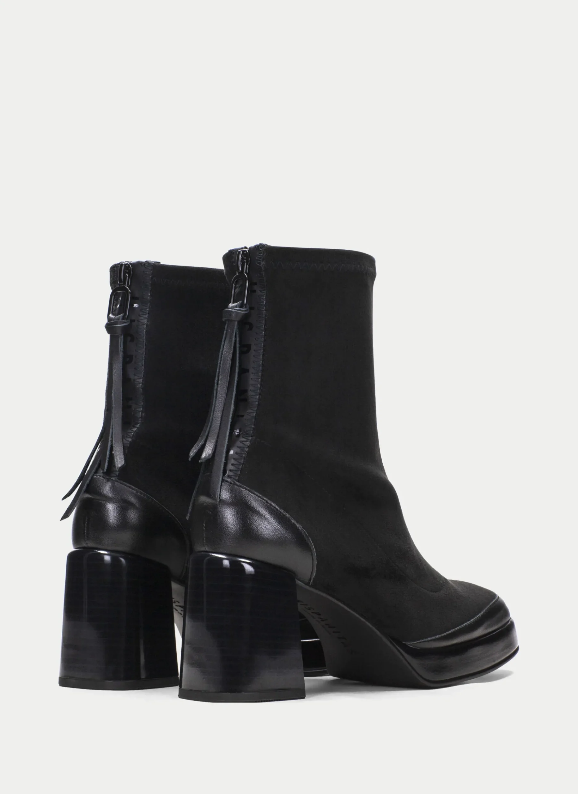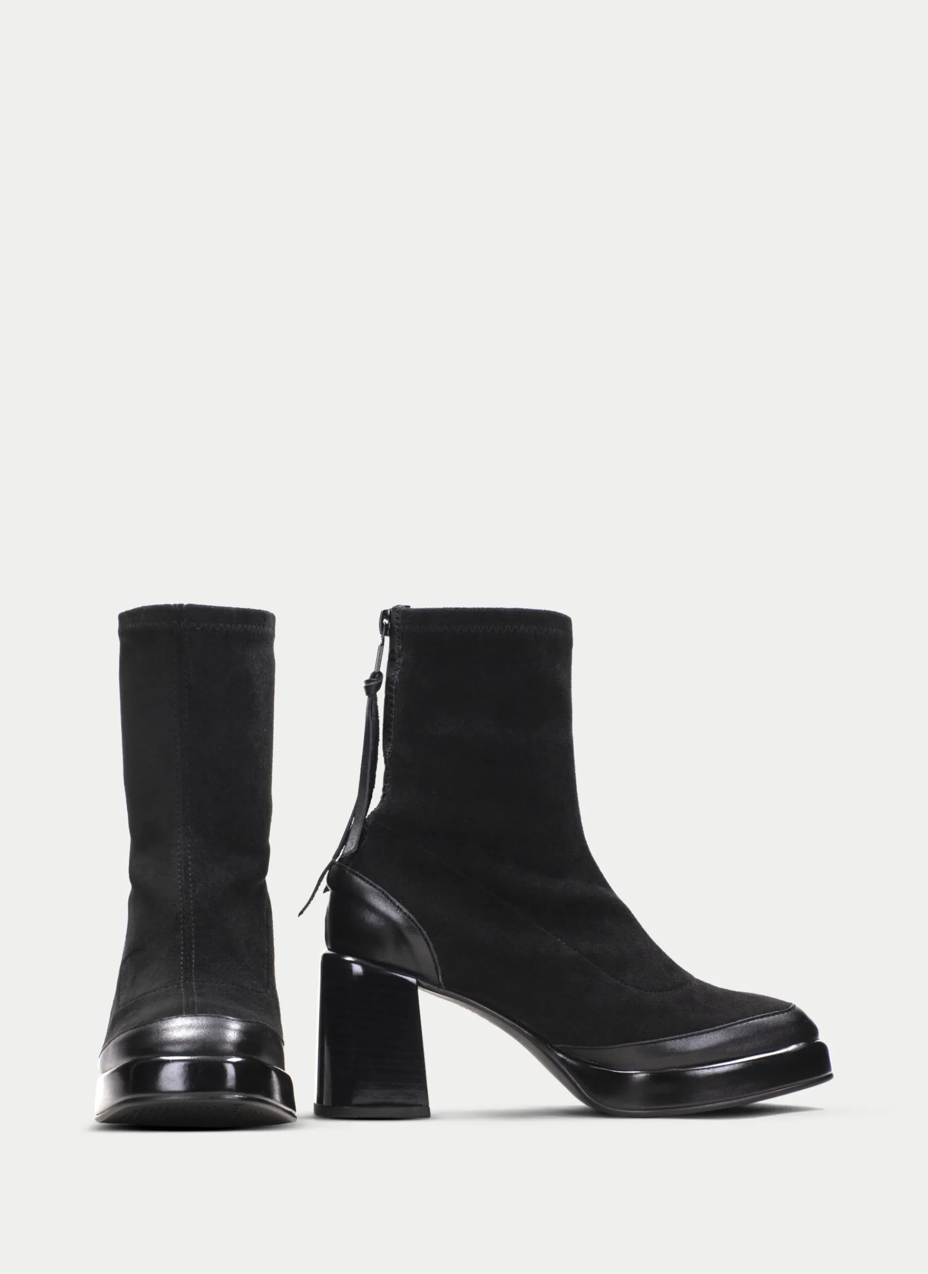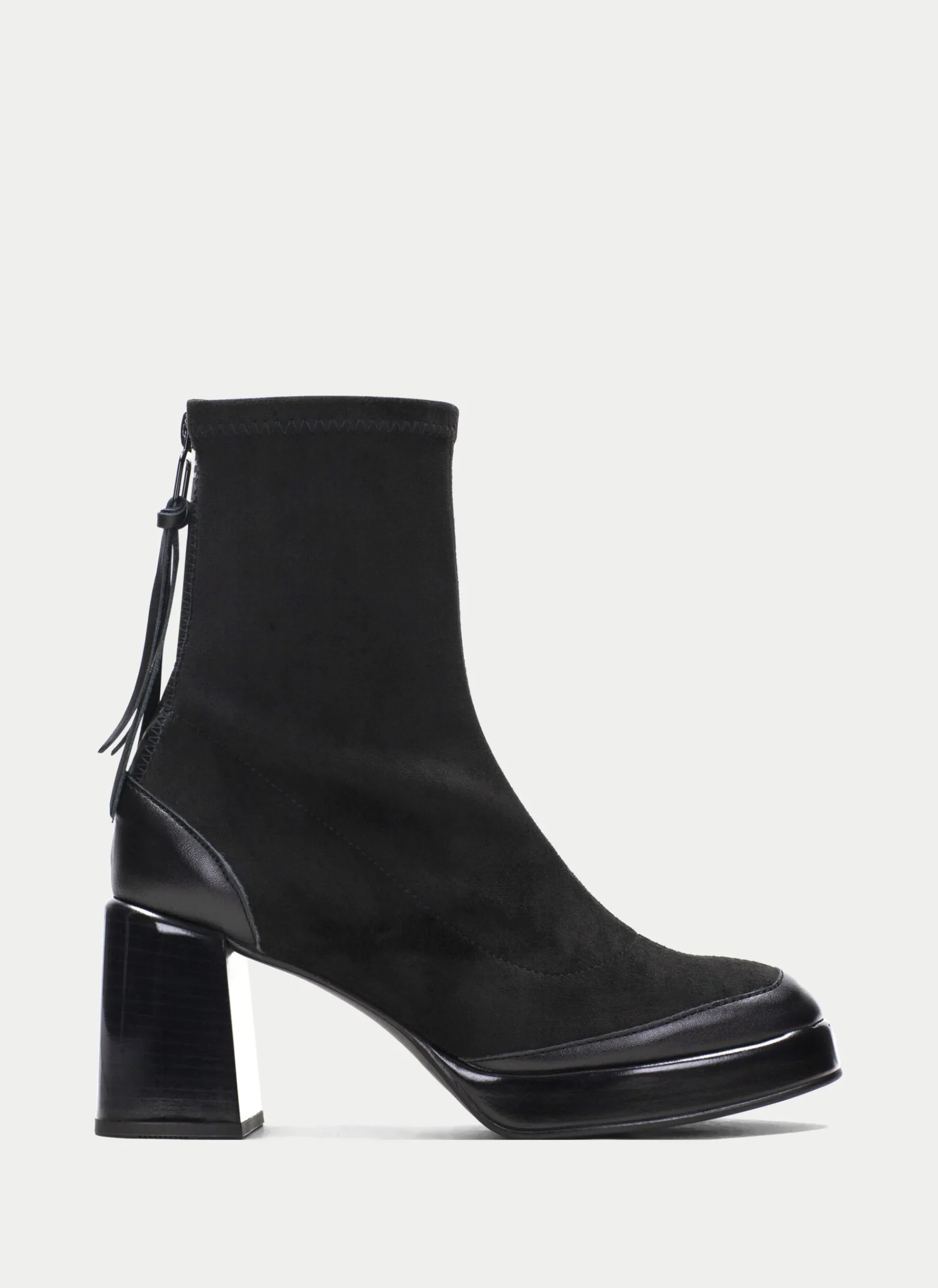 Botins com salto em bloco de 7 cm e biqueira redonda. Fecho de correr no peito do pé com o nome da marca. Este sapato incorpora a tecnologia TRIFLOW, que amortece cada passo, proporcionando flexibilidade e conforto na passada, graças ao seu amortecimento triplo.