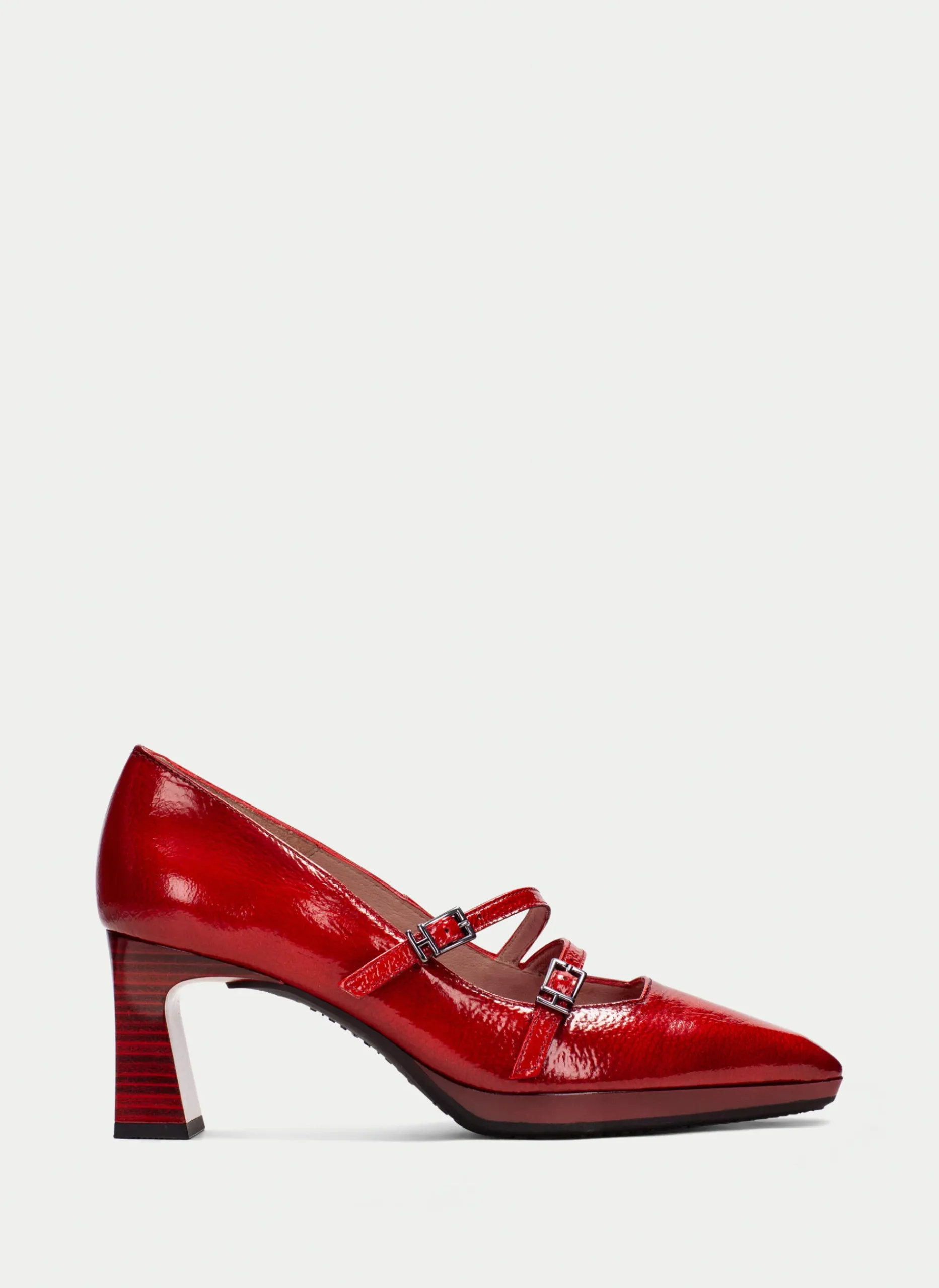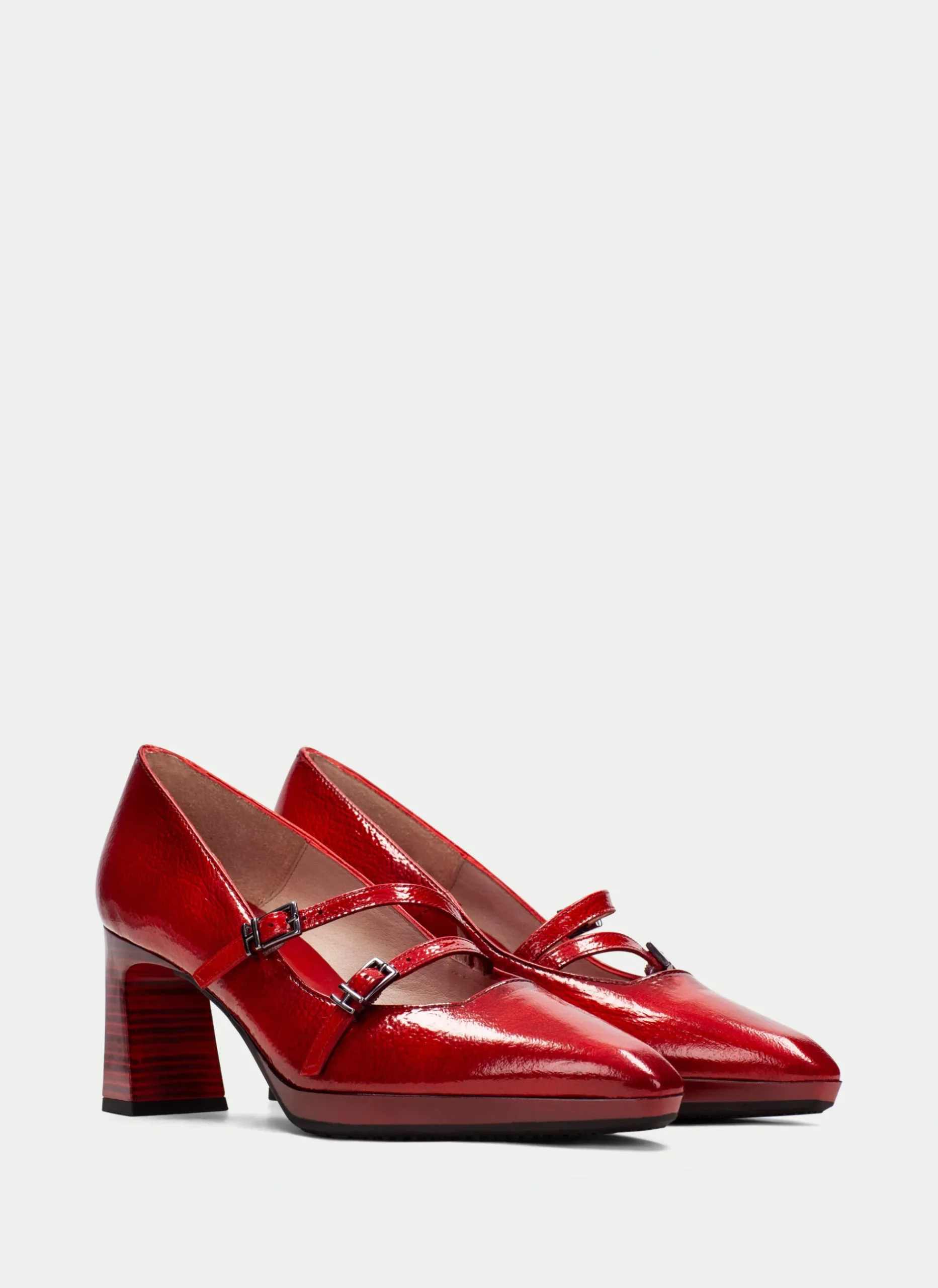 Sapatos de salto largo tipo Mary Jane com acabamento em efeito de pele envernizada e biqueira quadrada. Com design de 2 tiras finas cruzadas com fecho de fivela no peito do pé. Altura do salto de 7 cm.