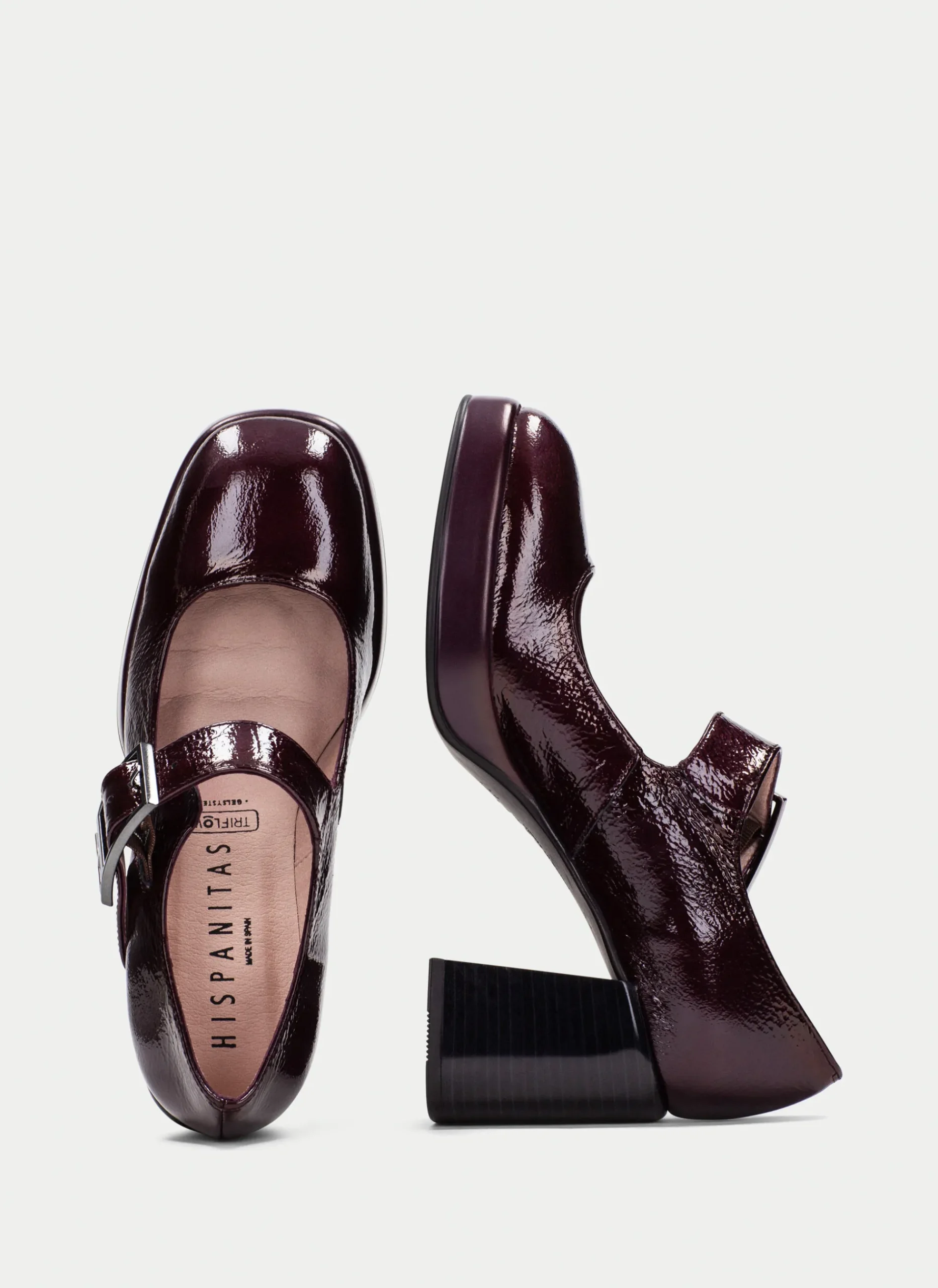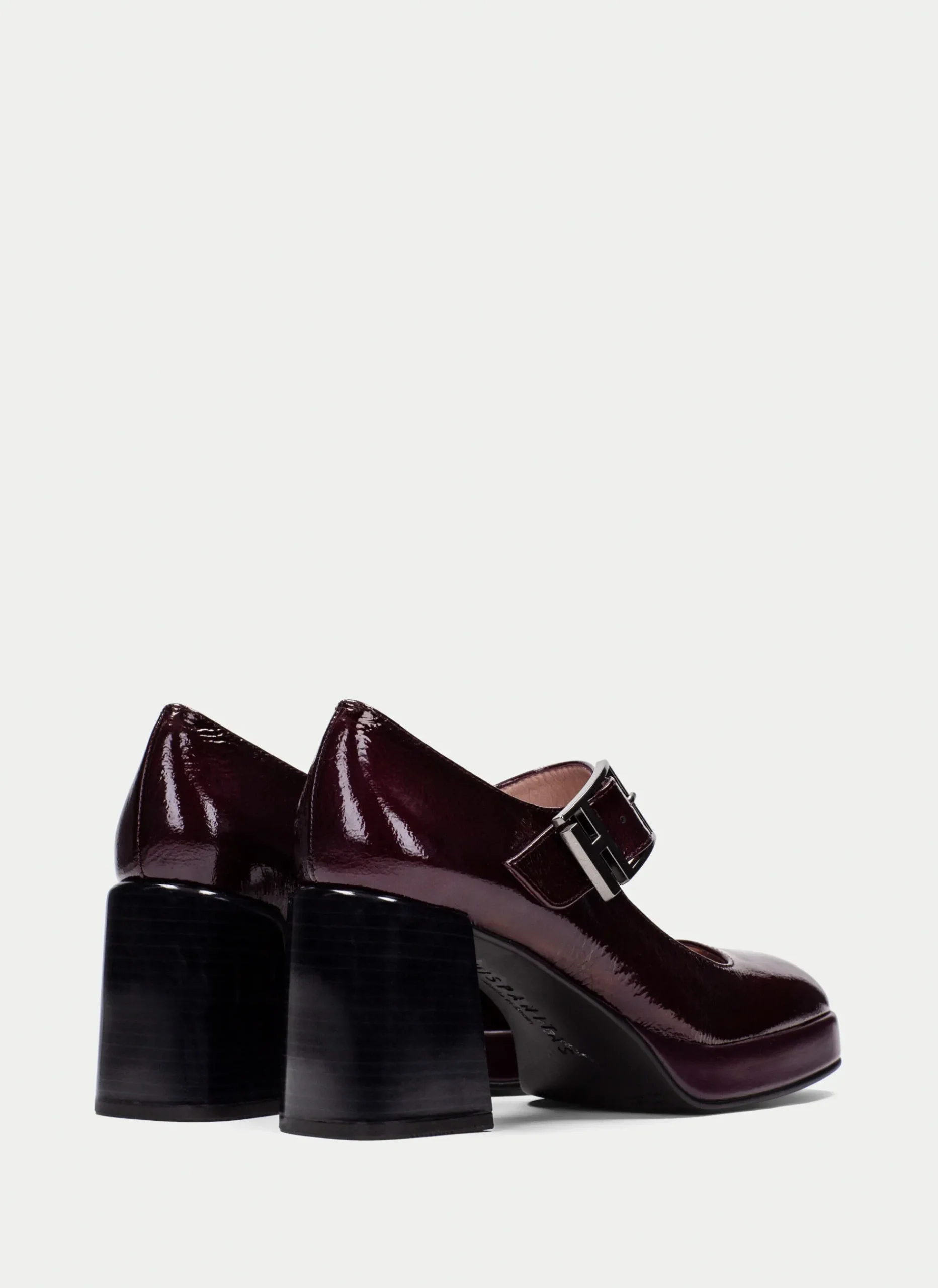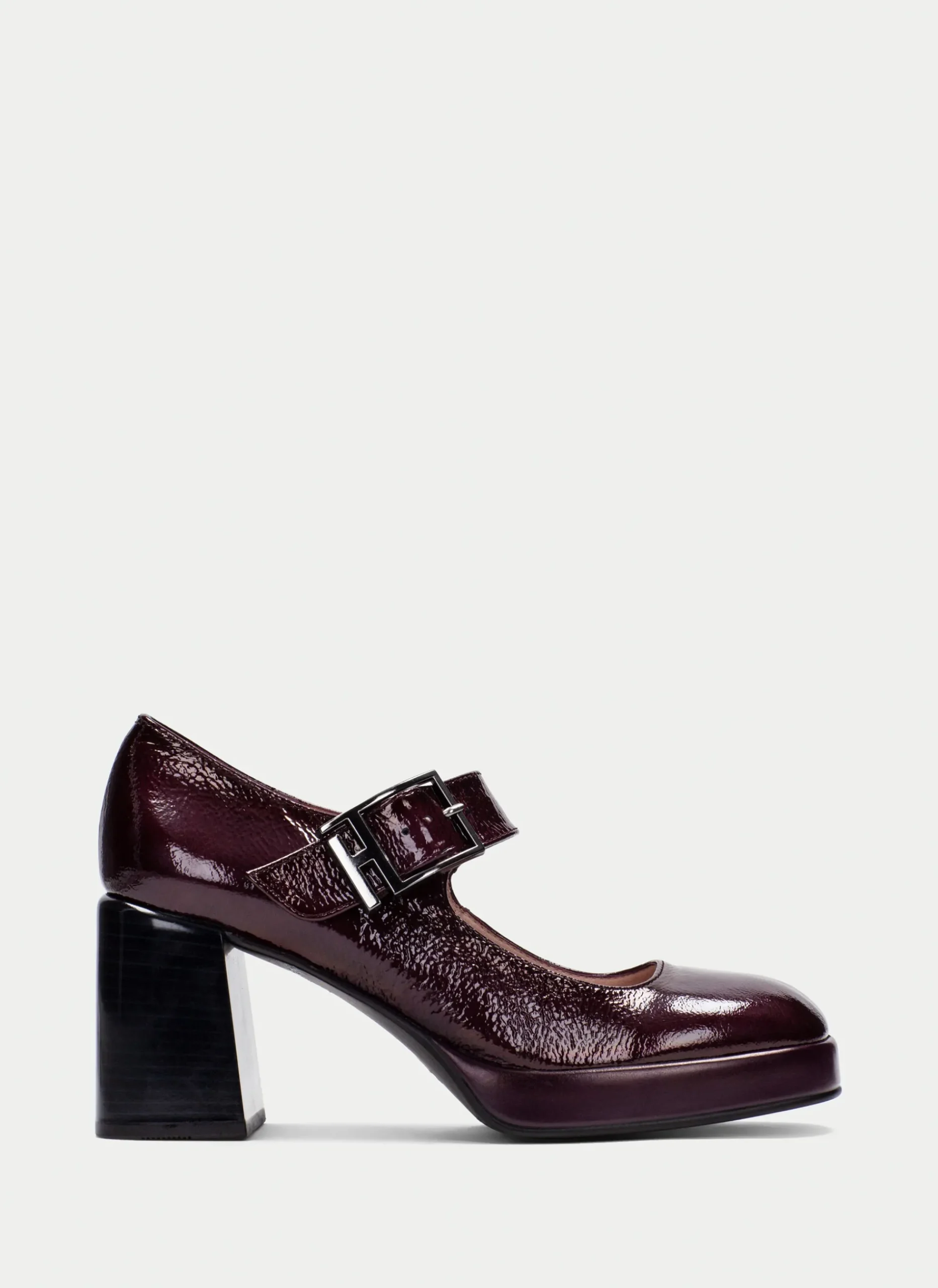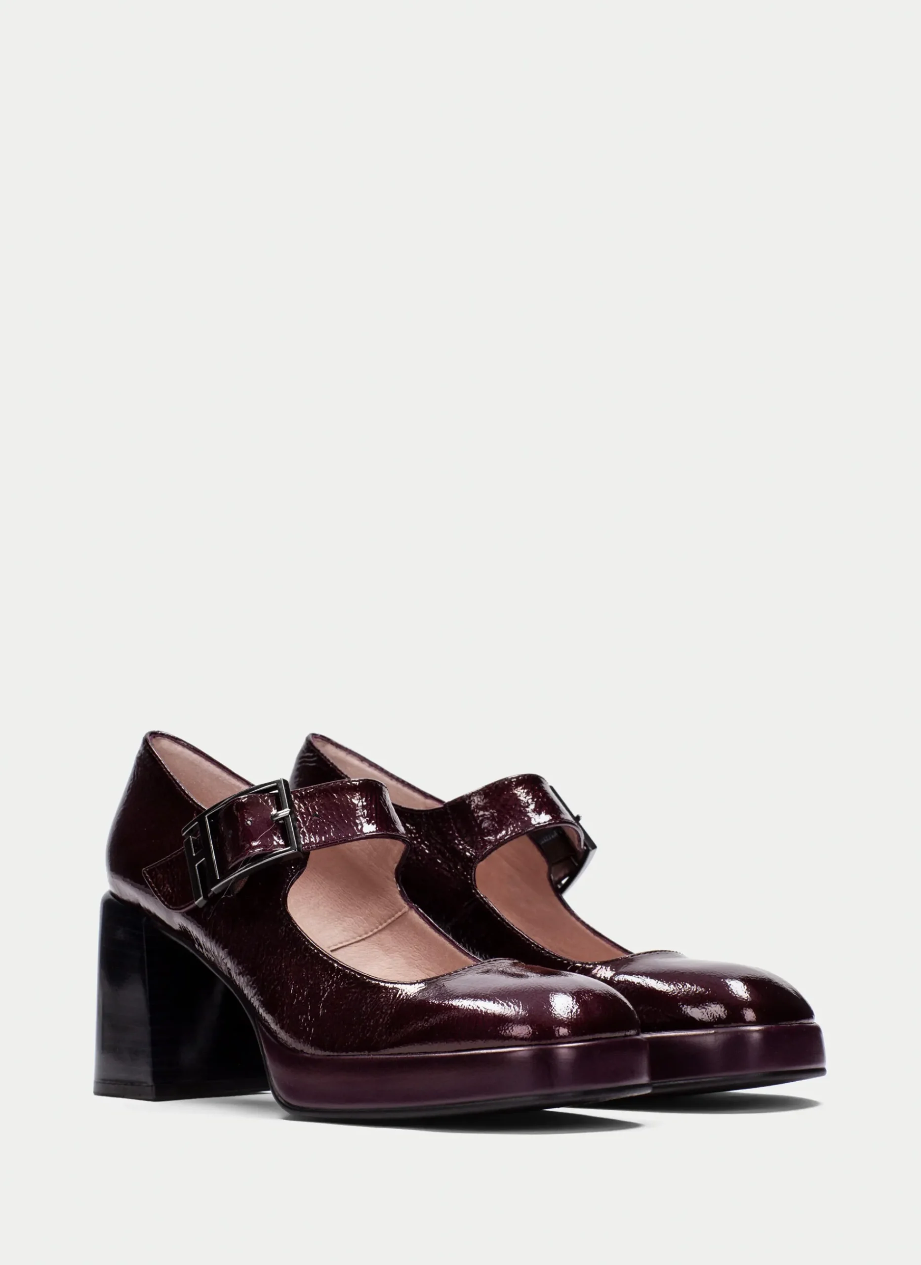 Sapatos Mary Jane com biqueira quadrada, salto bloco de 7 cm, plataforma de 2,5 cm e tira no peito do pé com fecho de fivela na lateral. Caracteriza-se pela pele com acabamento de pele envernizada, flexível e macia