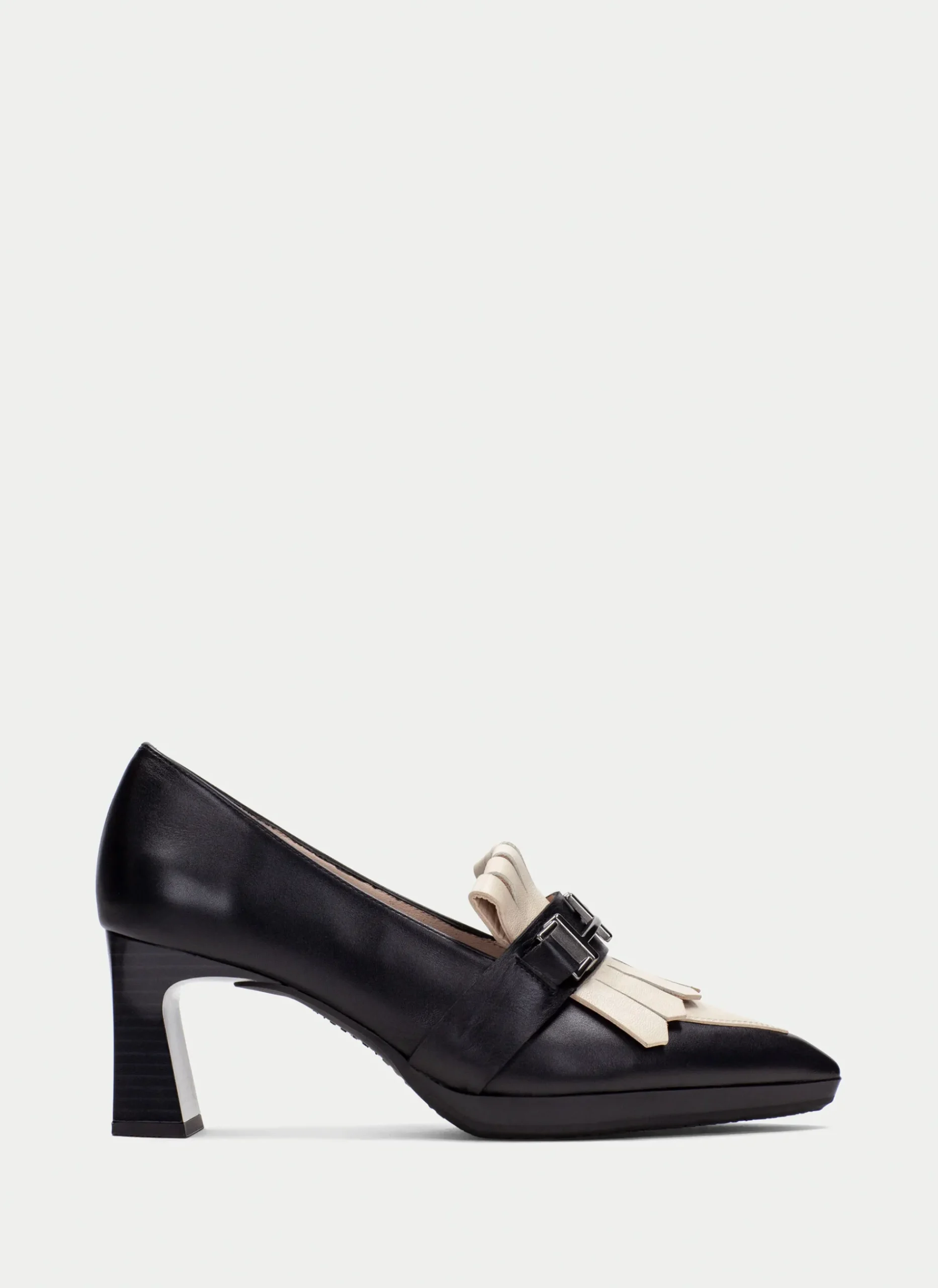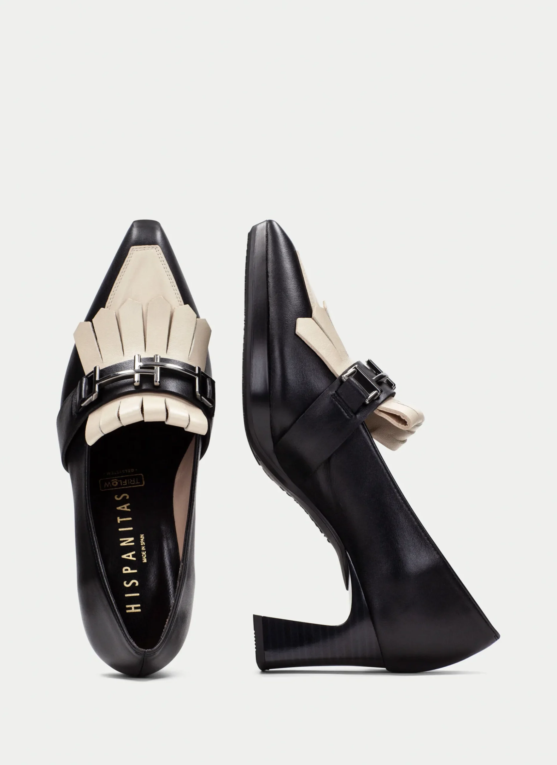 Sapato de couro com salto de 7 cm de altura. Este modelo apresenta detalhe de franjas no peito do pé e maxi fivela na parte frontal. Além disso, este sapato incorpora a tecnologia Triflow, amortecendo cada passo e proporcionando flexibilidade e conforto graças ao seu triplo amortecimento.