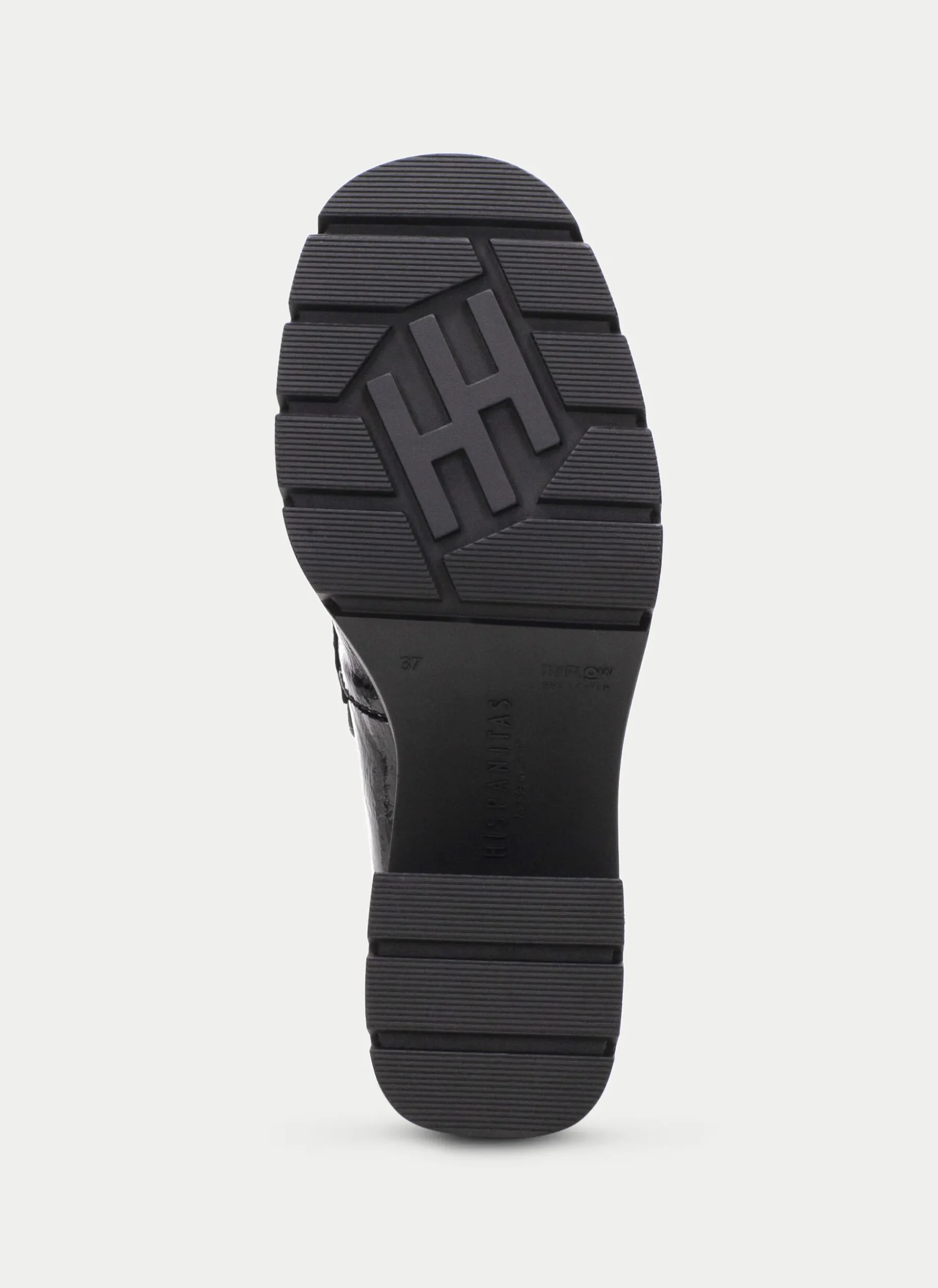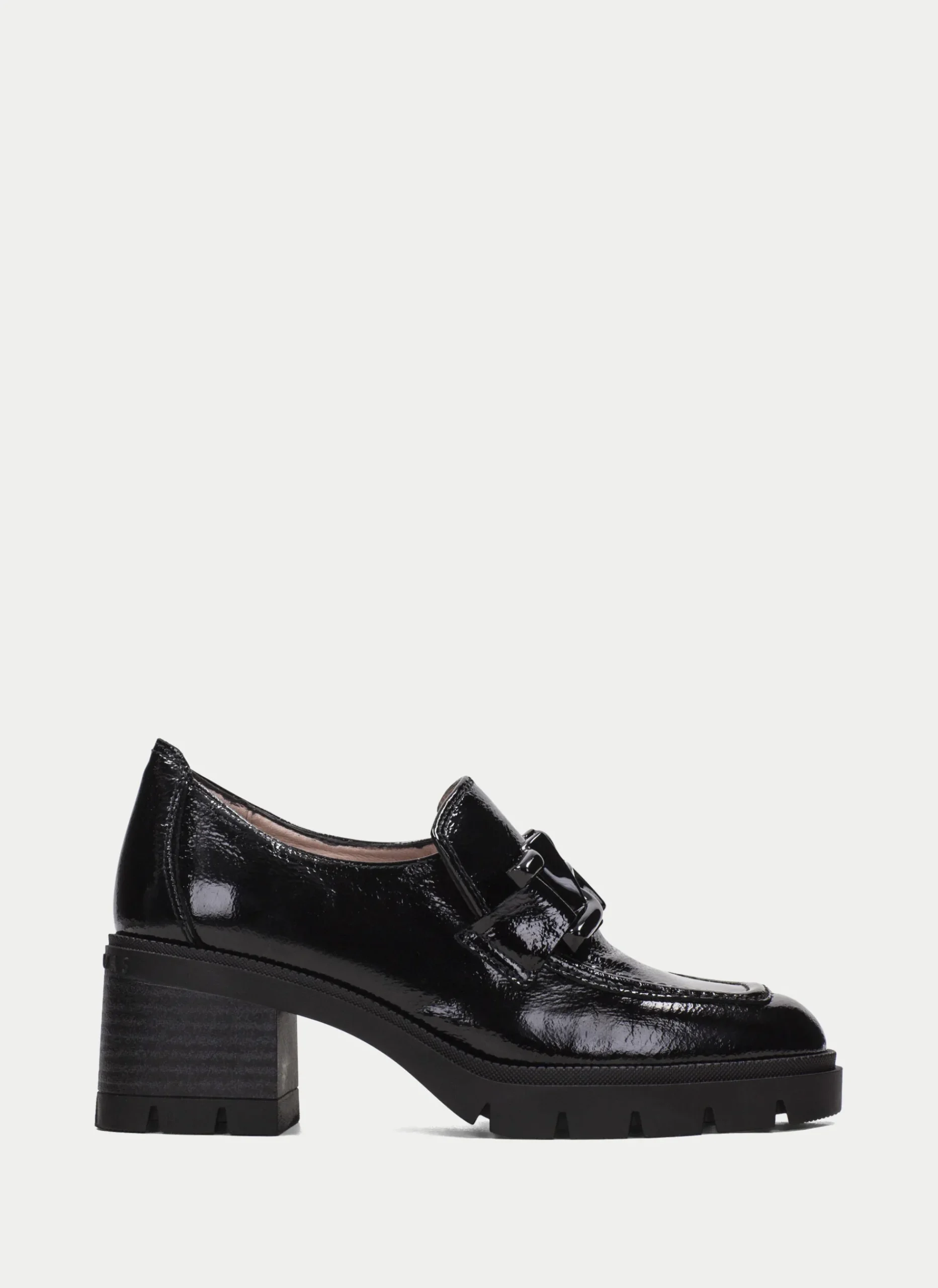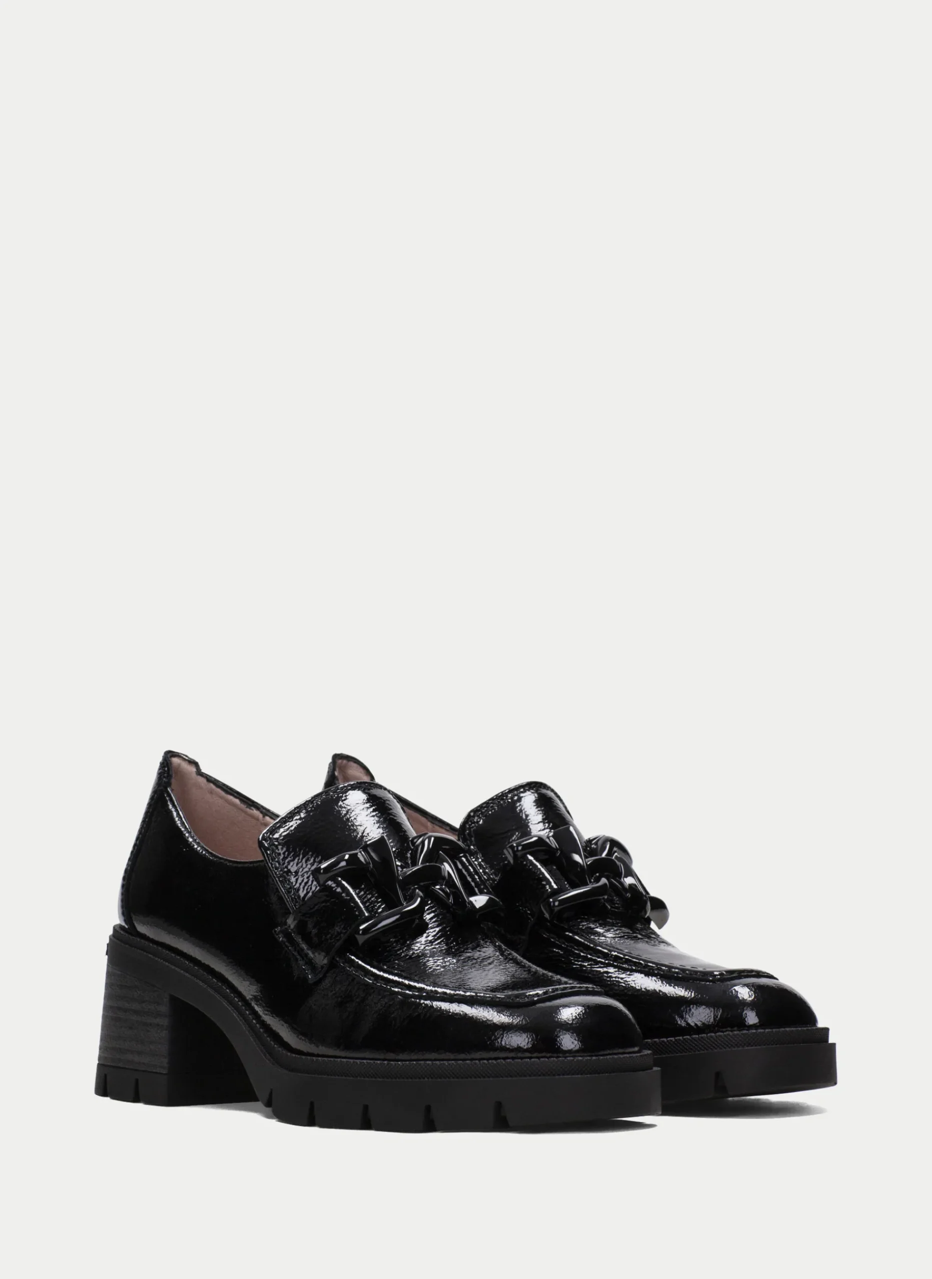 “Mocassins fabricados em Espanha, em pele, com sola track, salto em bloco e adorno no peito do pé. Este modelo incorpora a tecnologia TRIFLOW, que amortece cada passo proporcionando flexibilidade e conforto, graças ao seu amortecimento triplo.Altura: 6,5 cm.”