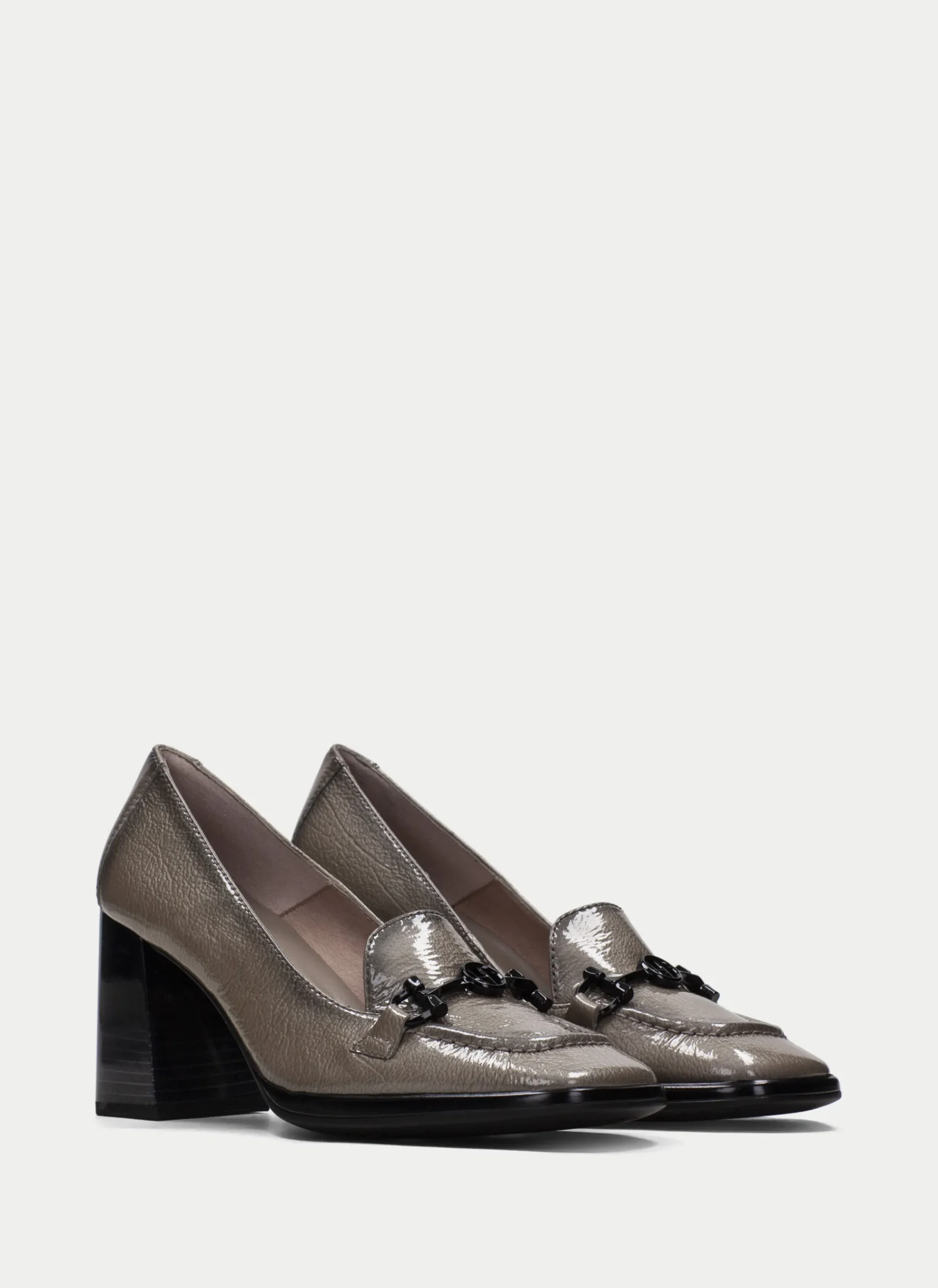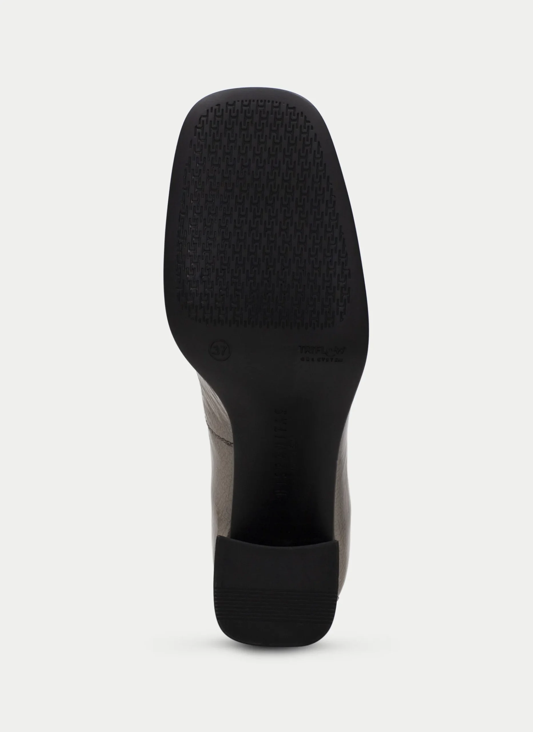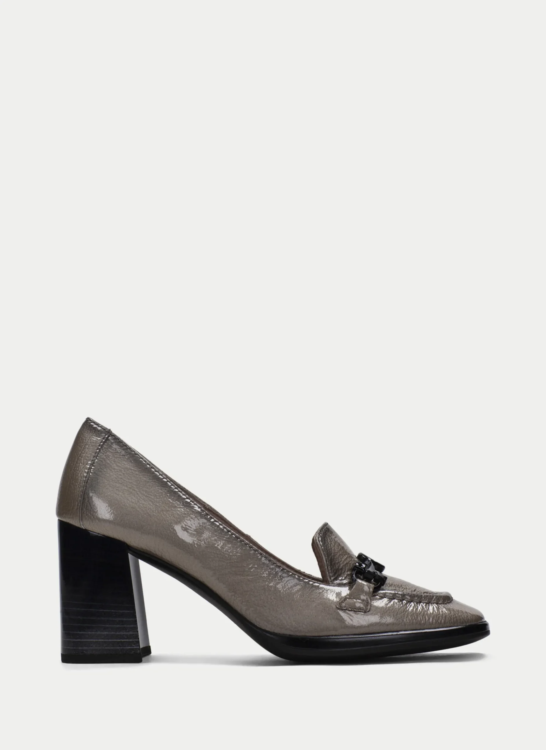 Sapatos de salão de biqueira quadrada, com ornamento no peito do pé e com um salto em bloco de 7,5 cm. Este sapato incorpora a tecnologia TRIFLOW, que amortece cada passo, proporcionando flexibilidade e conforto na passada, graças ao seu amortecimento triplo.
