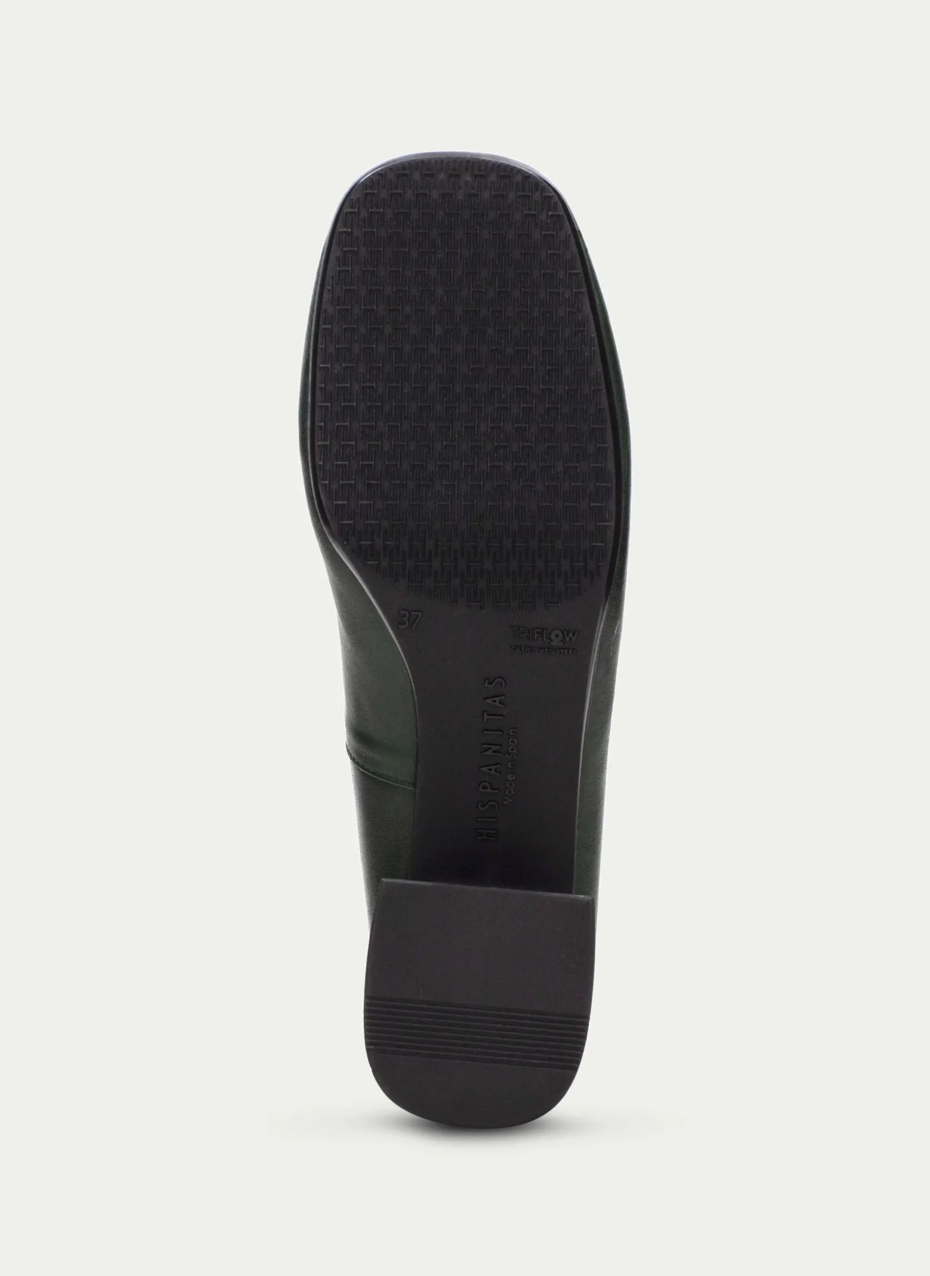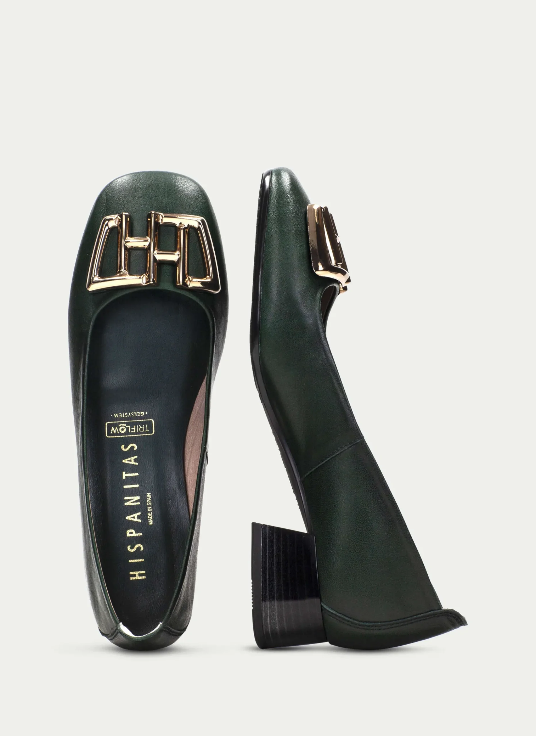 Sabrinas em pele com ornamento de duplo “H” na biqueira e salto em bloco. Este modelo incorpora a tecnologia TRIFLOW, que amortece cada passo, proporcionando flexibilidade e conforto, graças ao seu amortecimento triplo.