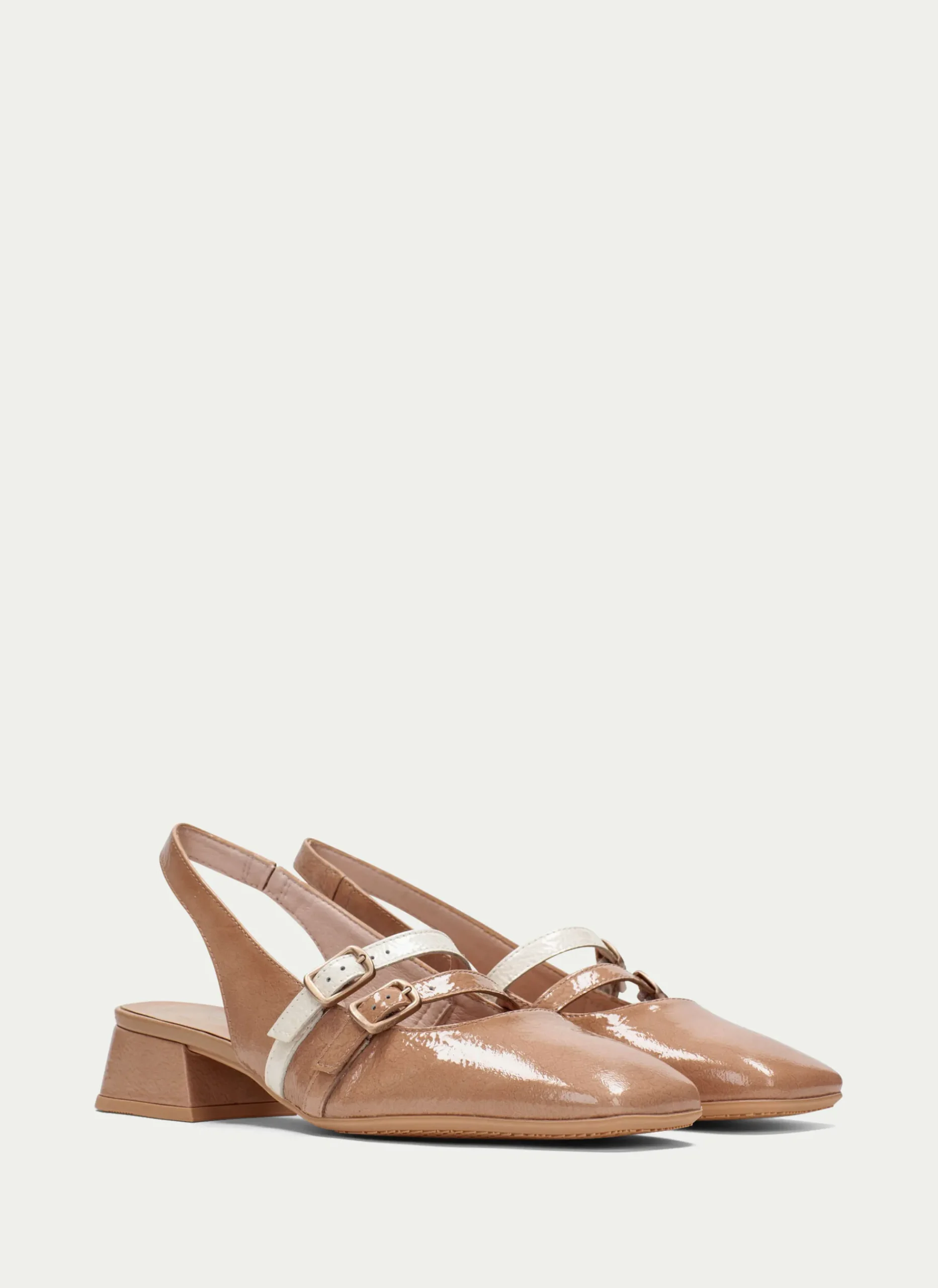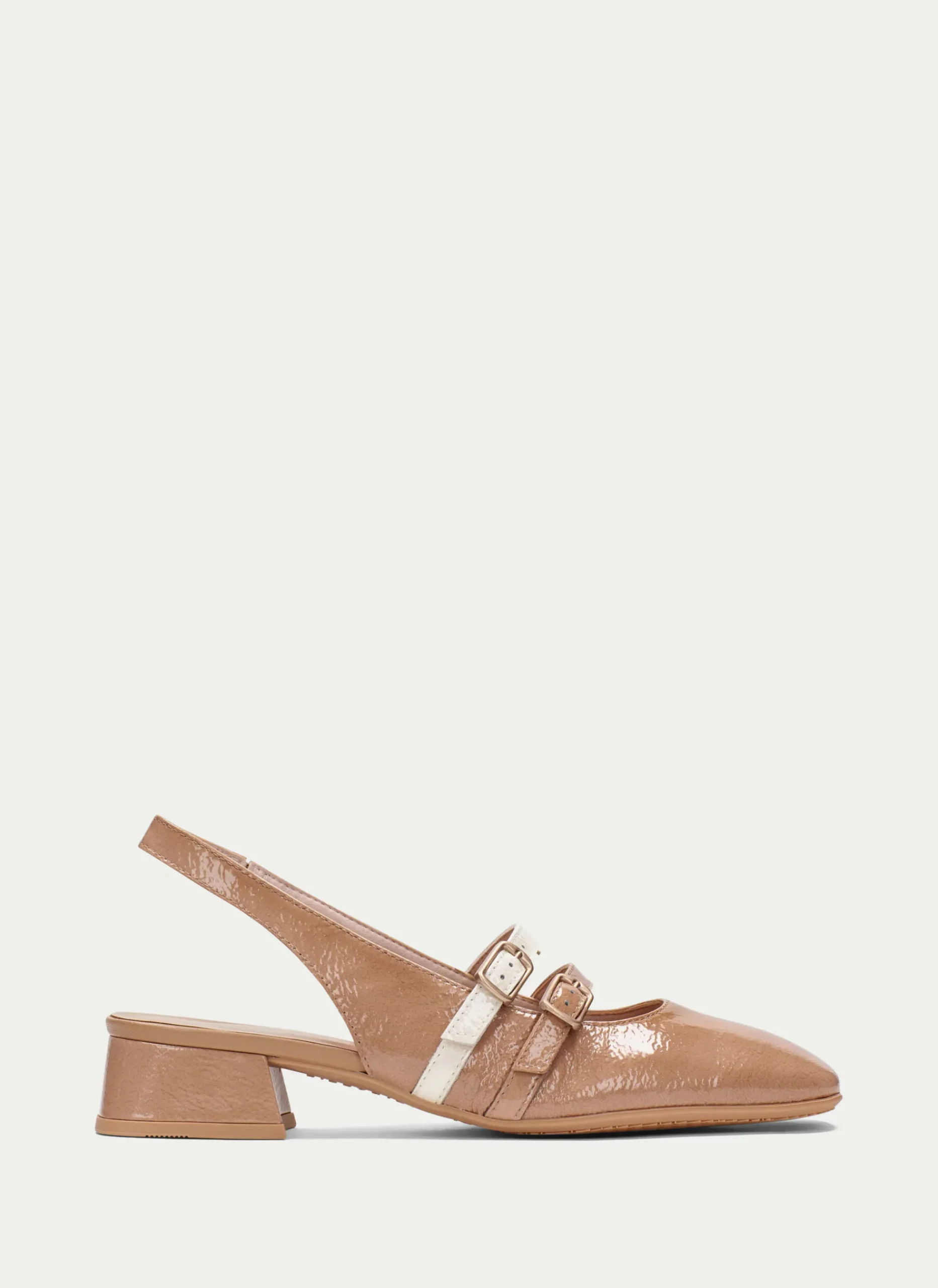 Sapatos de salto alto com biqueira quadrada em pele, com um salto de 3 cm de altura. Um modelo estilo bailarina com duas tiras finas paralelas com fecho de fivela no peito do pé, permitindo um ajuste perfeito ao pé. Este sapato incorpora a tecnologia Triflow, um amortecimento triplo que gera um efeito de amortecimento na pegada.