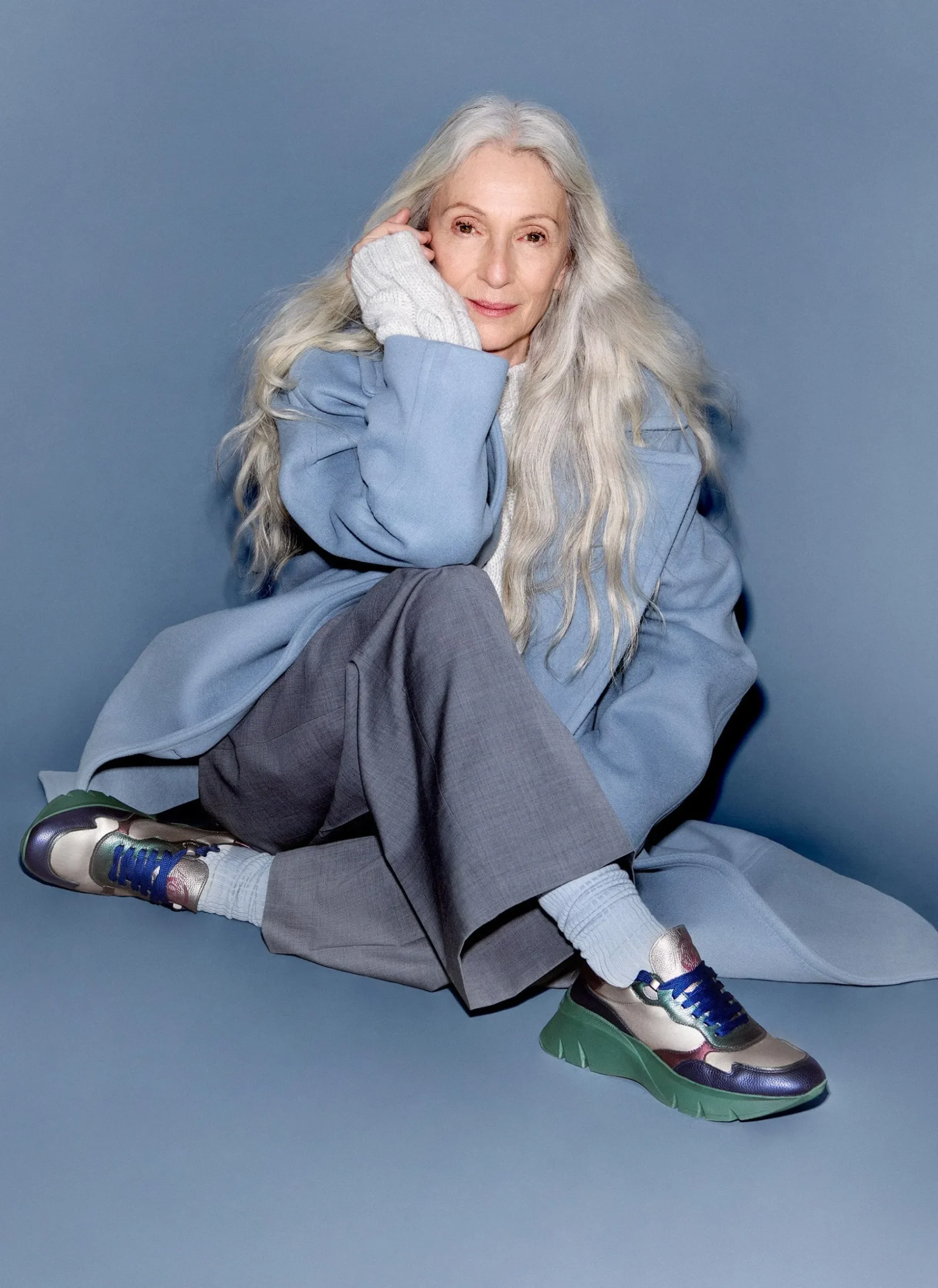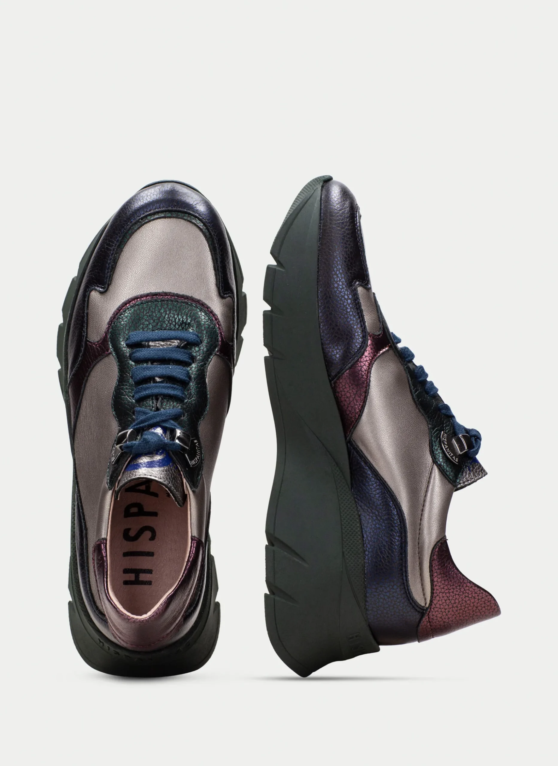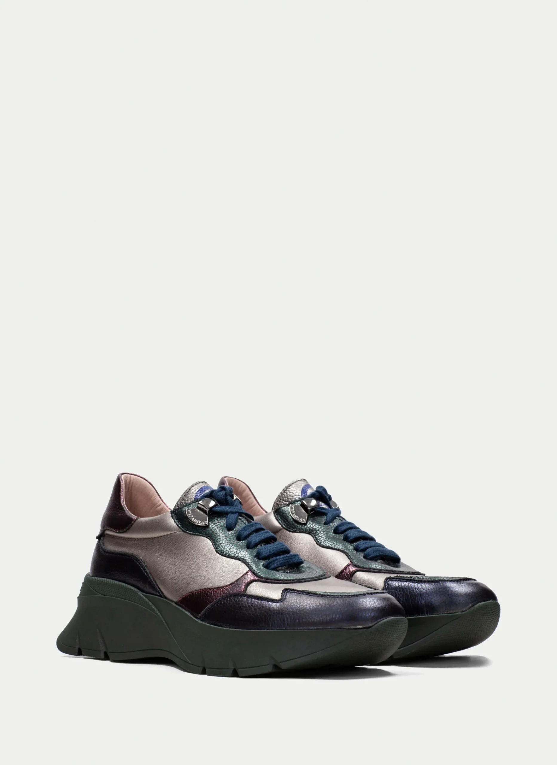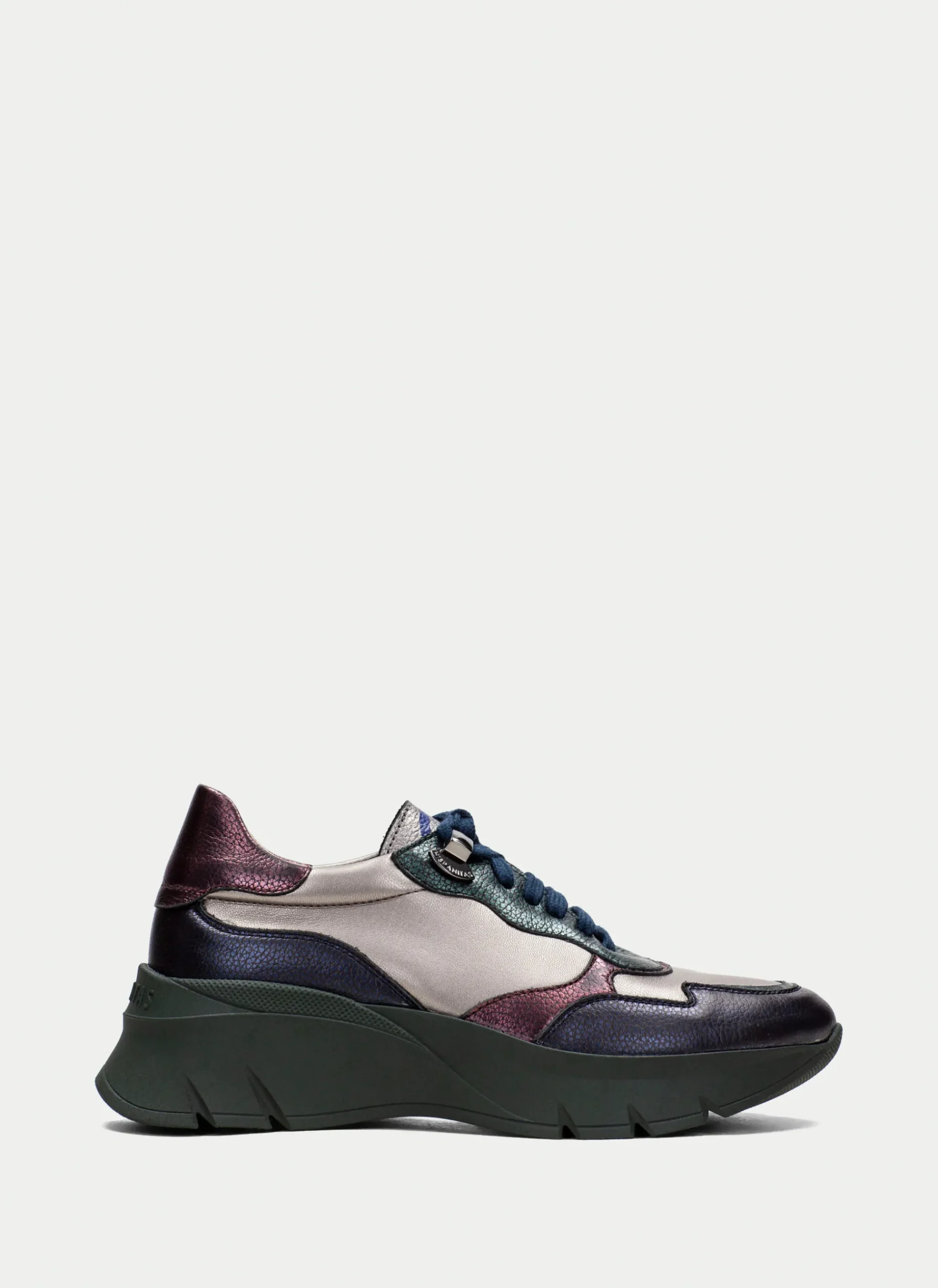 Tênis com sola de volume de 5 cm, confeccionado com uma combinação original de materiais composta por couro, tecido de flanela e glitter. Fechamento com cadarços. Este calçado conta com a tecnologia TRIFLOW, que amortece cada passo graças ao seu triplo acolchoamento. Além disso, possui palmilha removível.